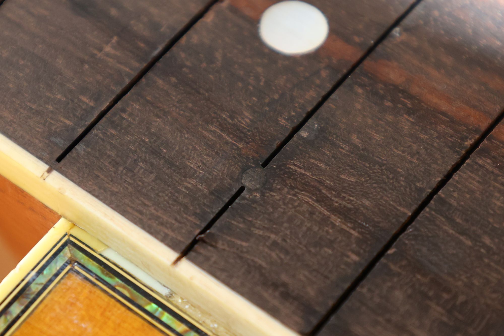 - 3.フレット交換の前にフィンガーボードにあけた穴を元に戻しましょう。穴径にあうようにエボニー片を丸く削ります。