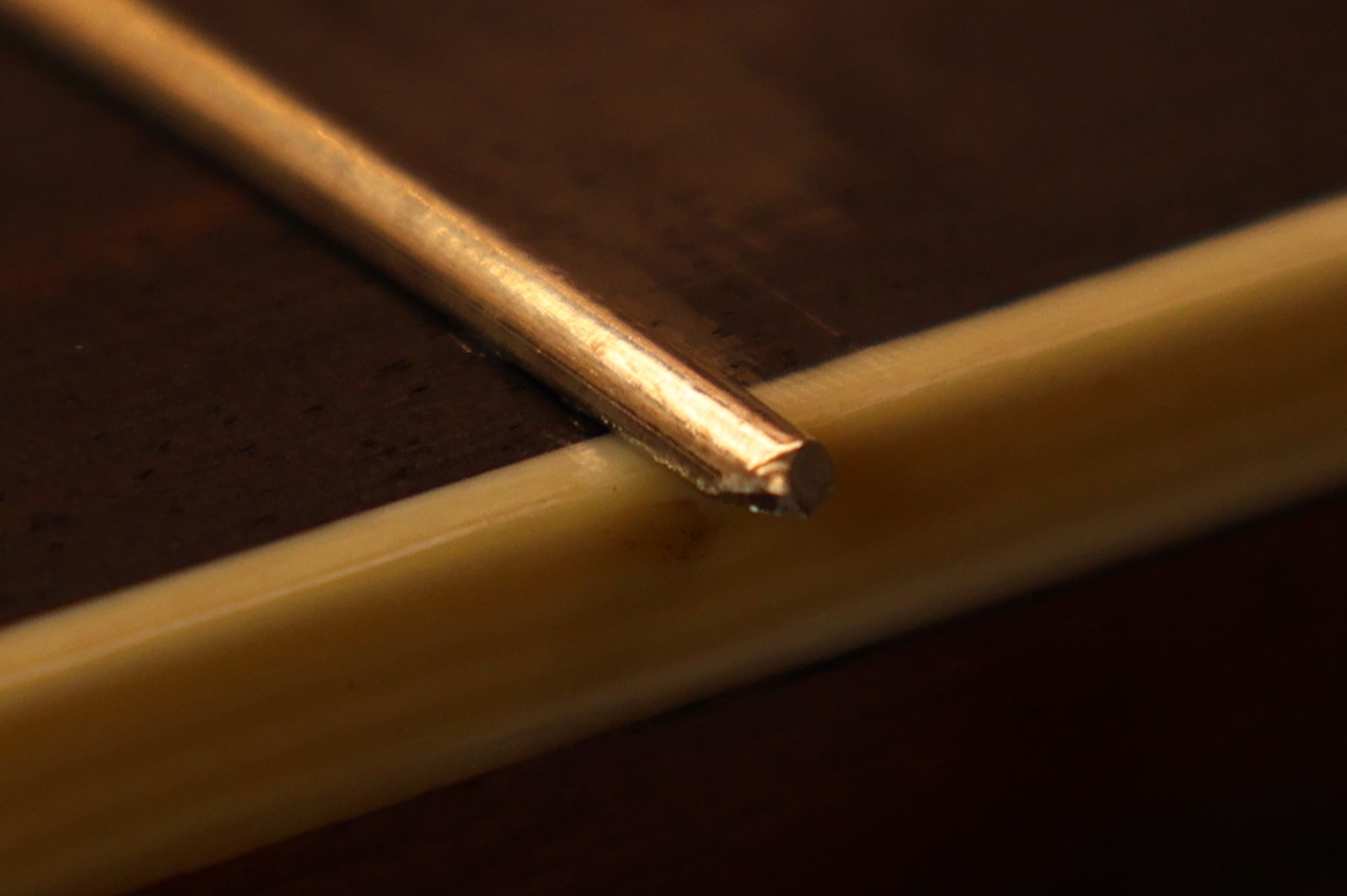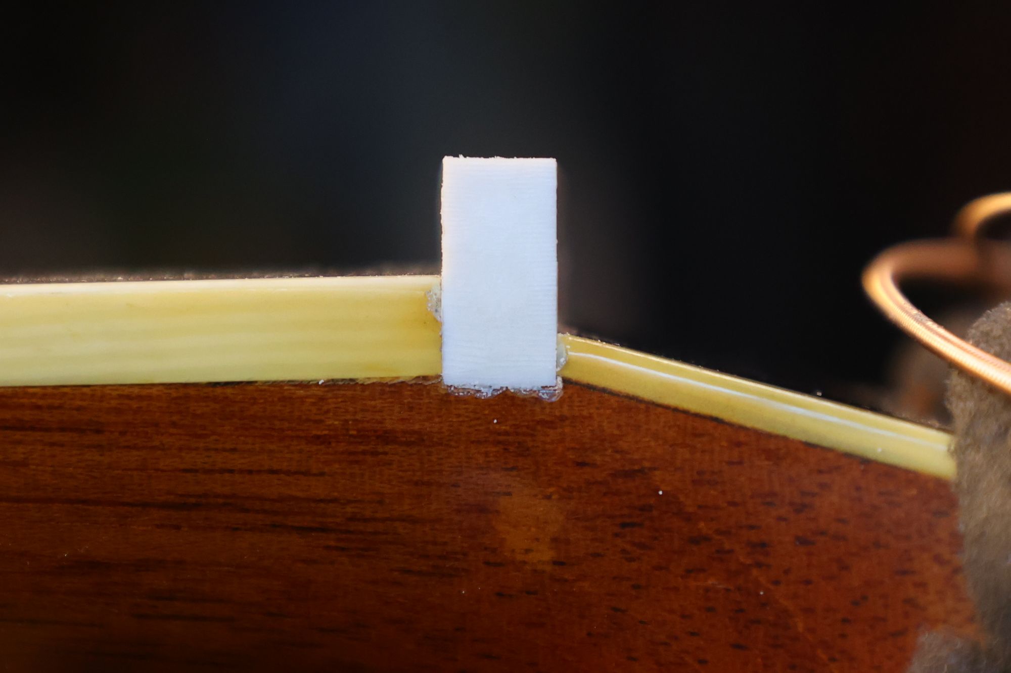 - 4.ドリル穴にエボニー材を押し込み、フィンガーボードを傷つけないように出た部分をカットします。