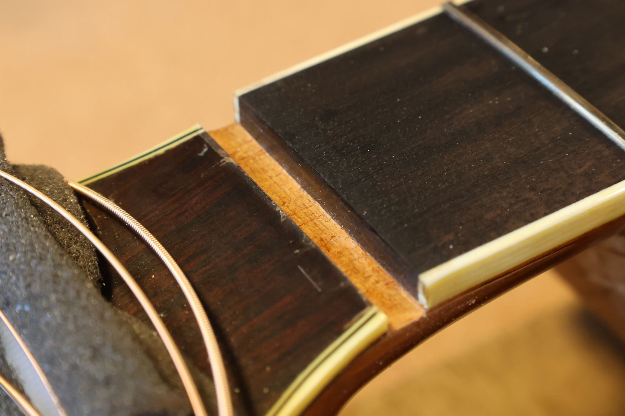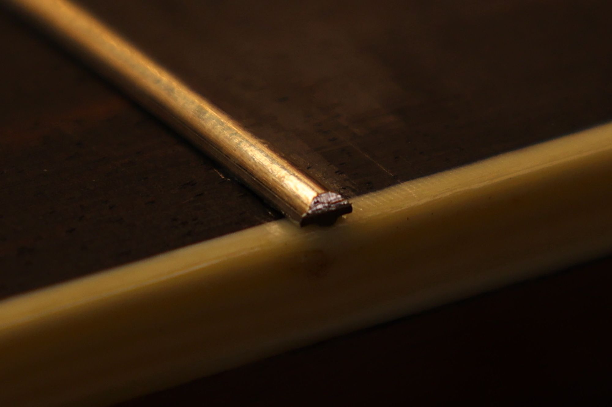 - 12.目視および指で触ってネック、フィンガーボードと段差のないことを確認しておきます。