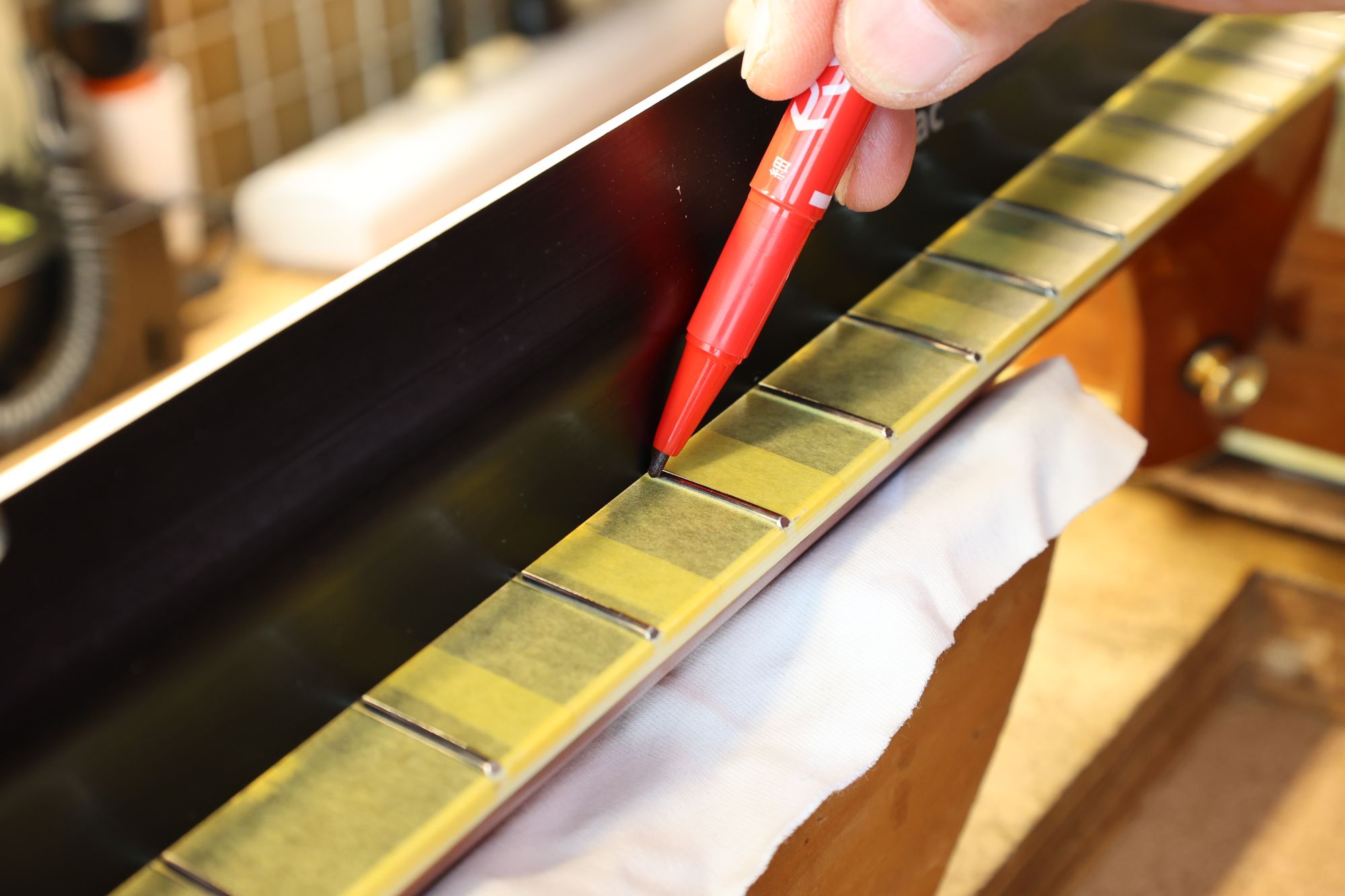 - 37.直定規を乗せて、フレット山が凹んでいる箇所にマークを入れます。