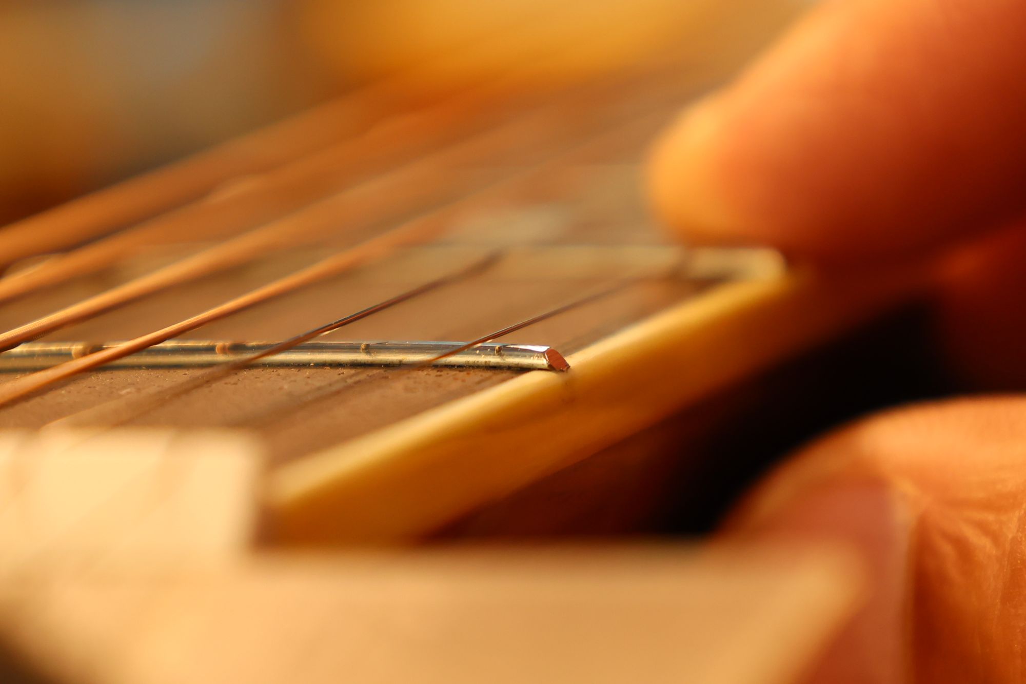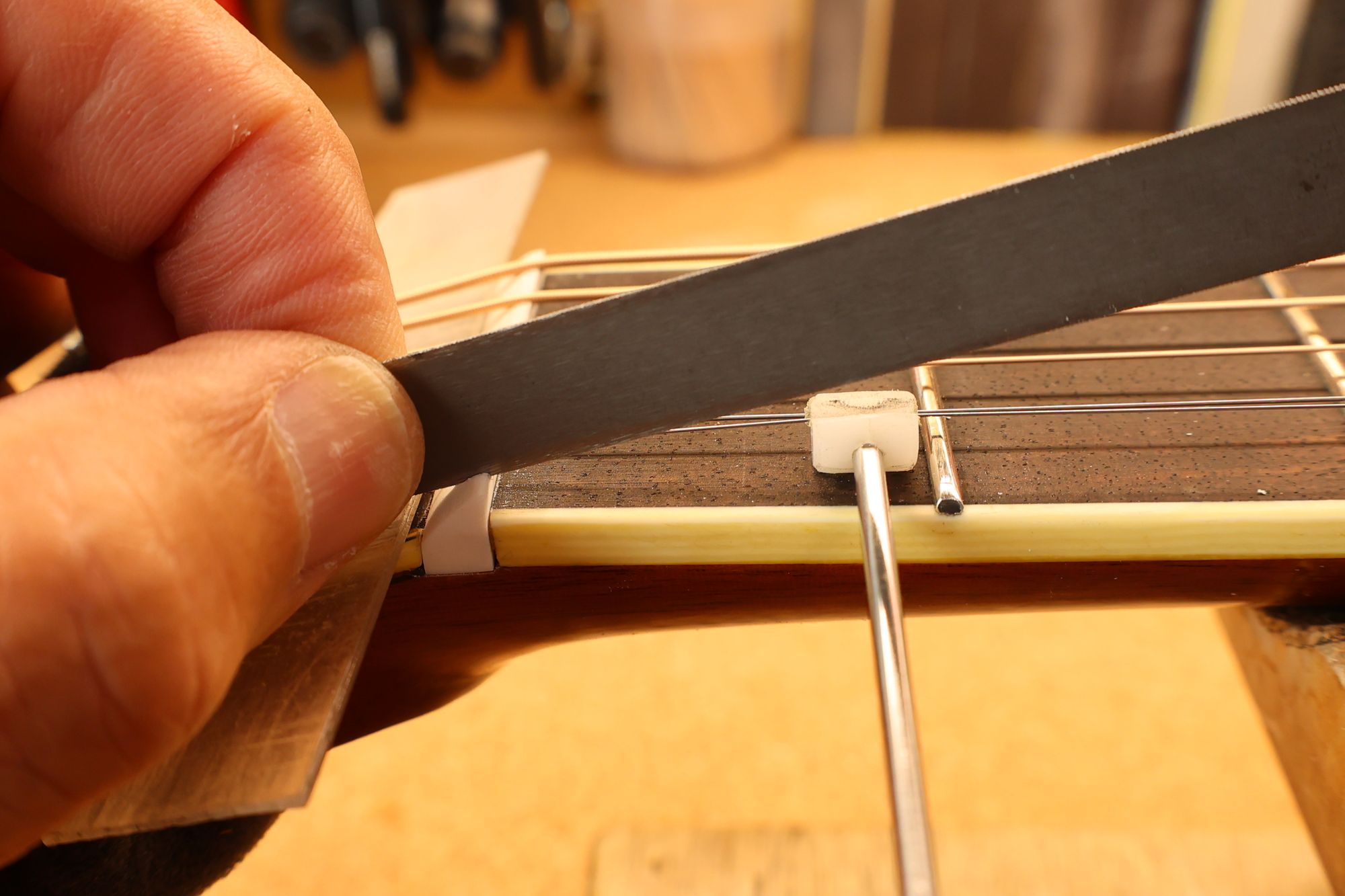 - 21.弦を張って弦高調整を行います。2フレットを指で押さえて1フレットと弦の隙間がギリギリに下がるまでナット高を下げます。