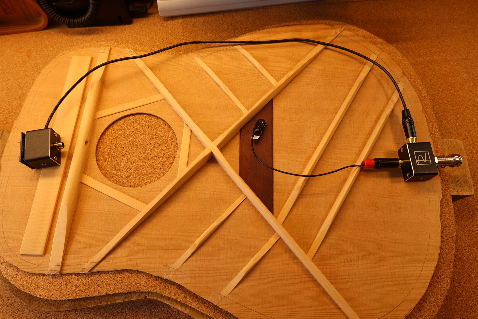- 1.サウンドホールにチューナー、サドル位置にイントネーターを取り付けました。