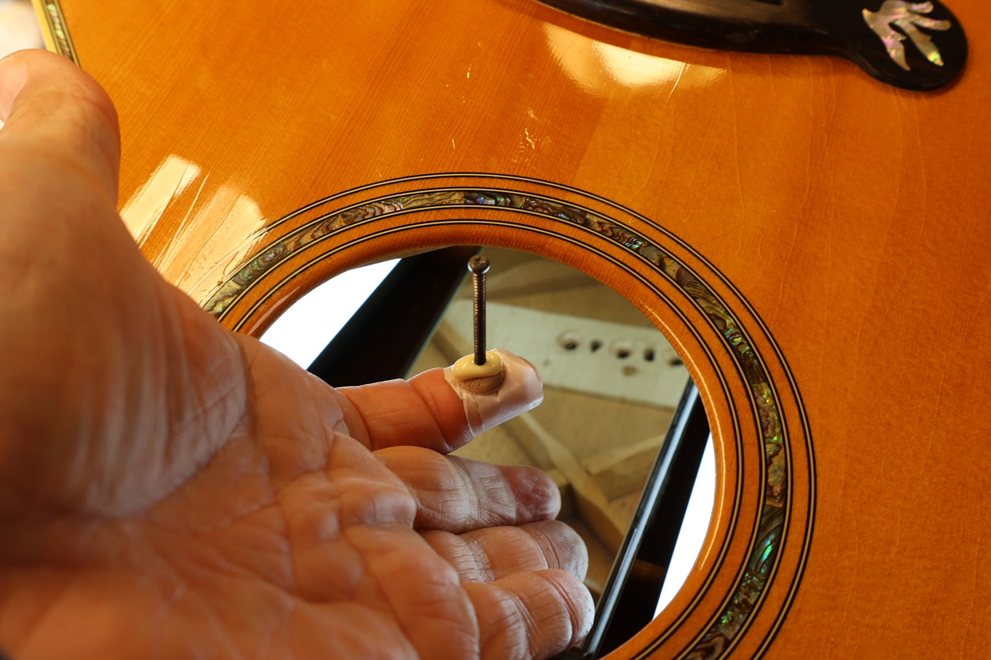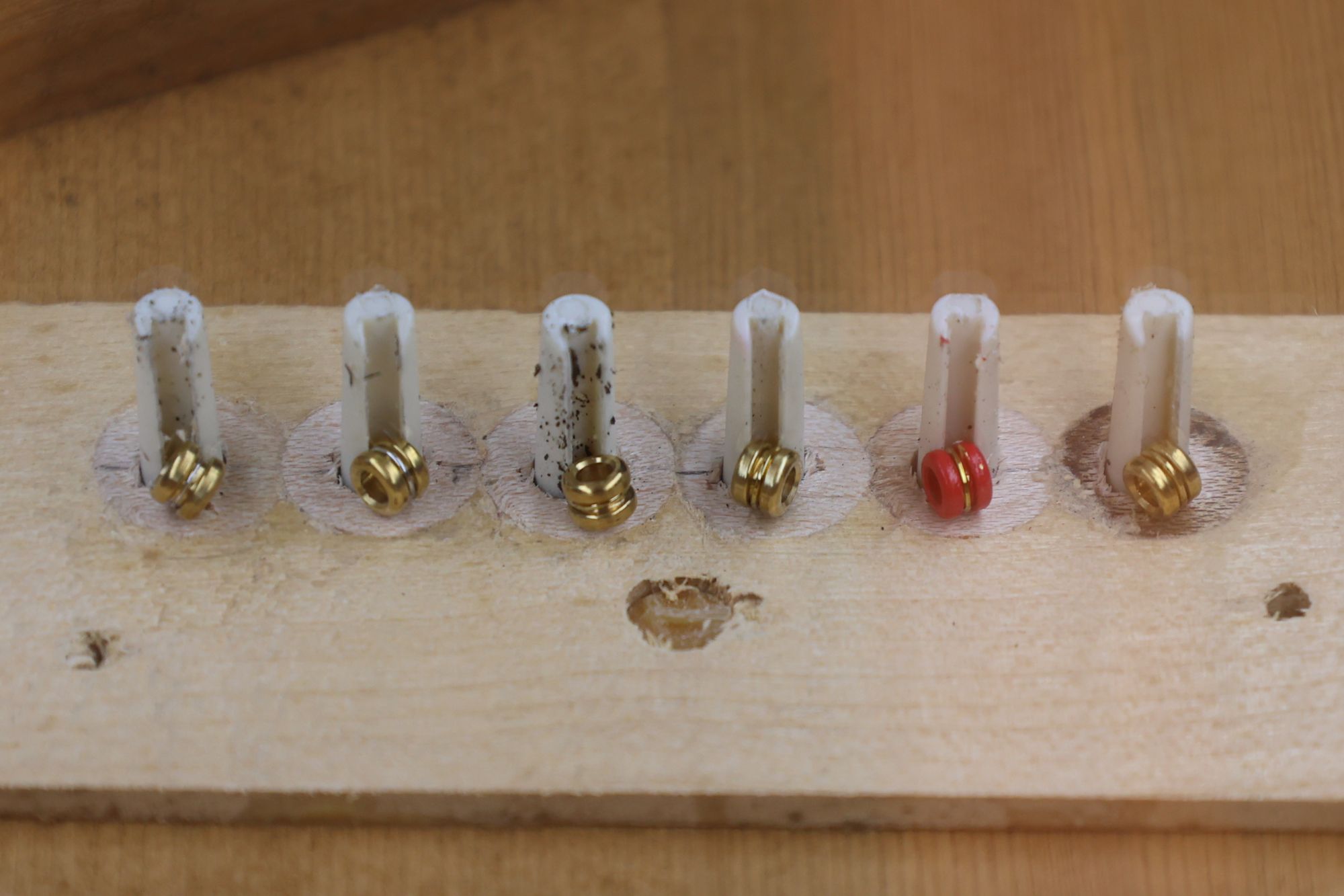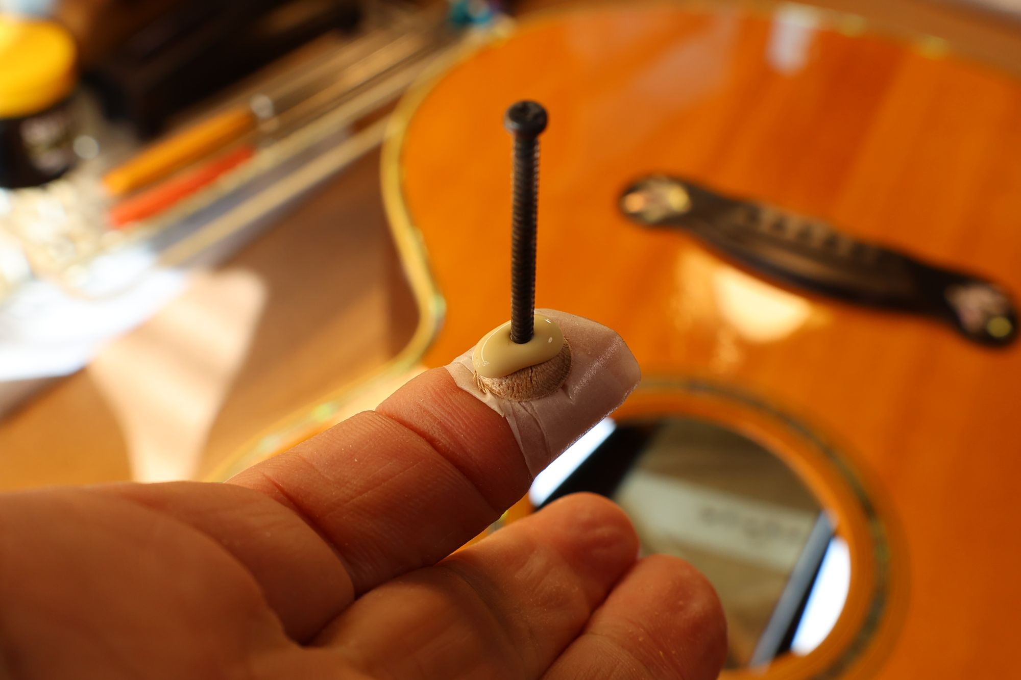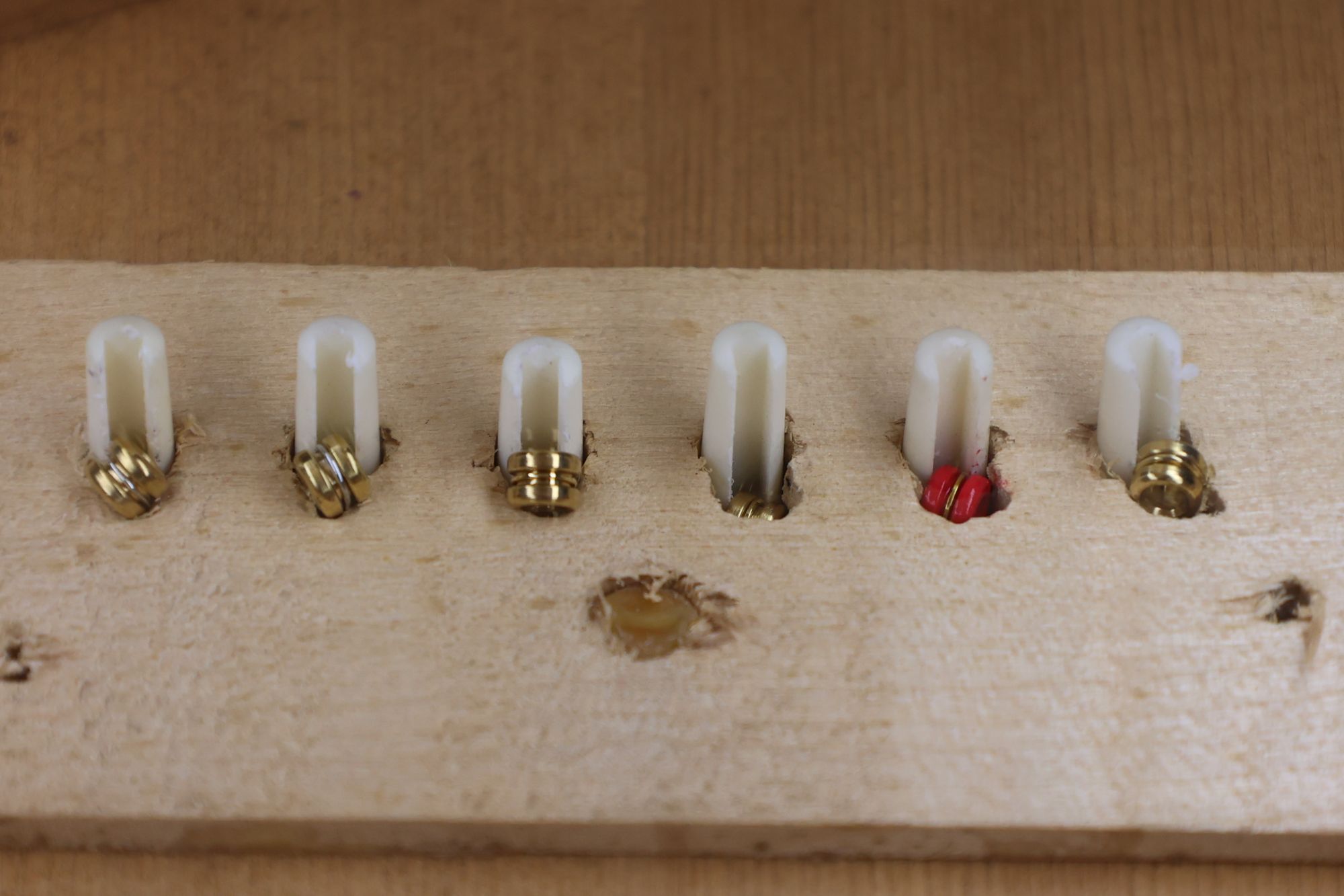 - 19.1,3,5弦のプラグ固着後、同じように2,4,6弦のプラグ接着を行います。