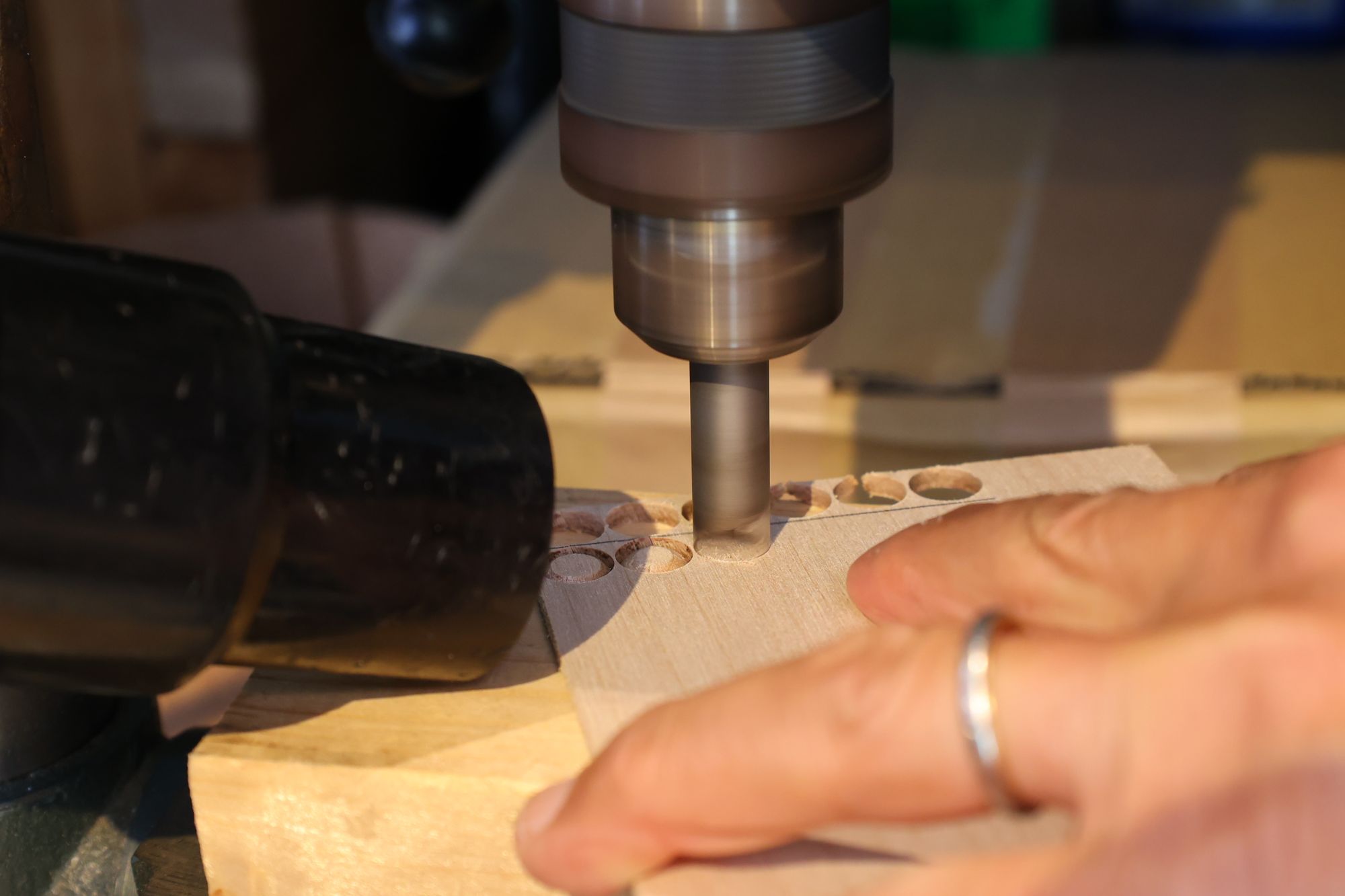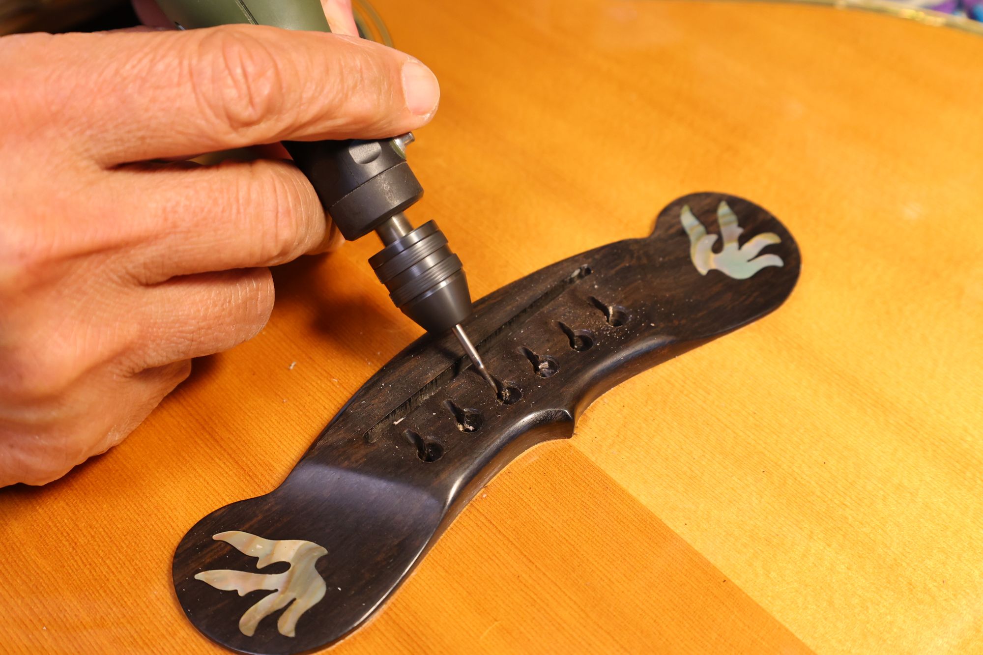 - 13.さらにミニルーターで弦の導出角度をつけていきます。
