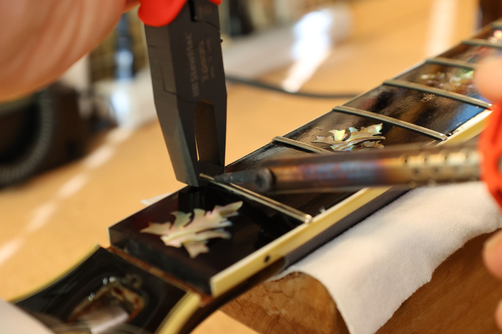 - 2.フレット溝を傷つけないようにハンダゴテで暖めながらゆっくりと抜いていきます。