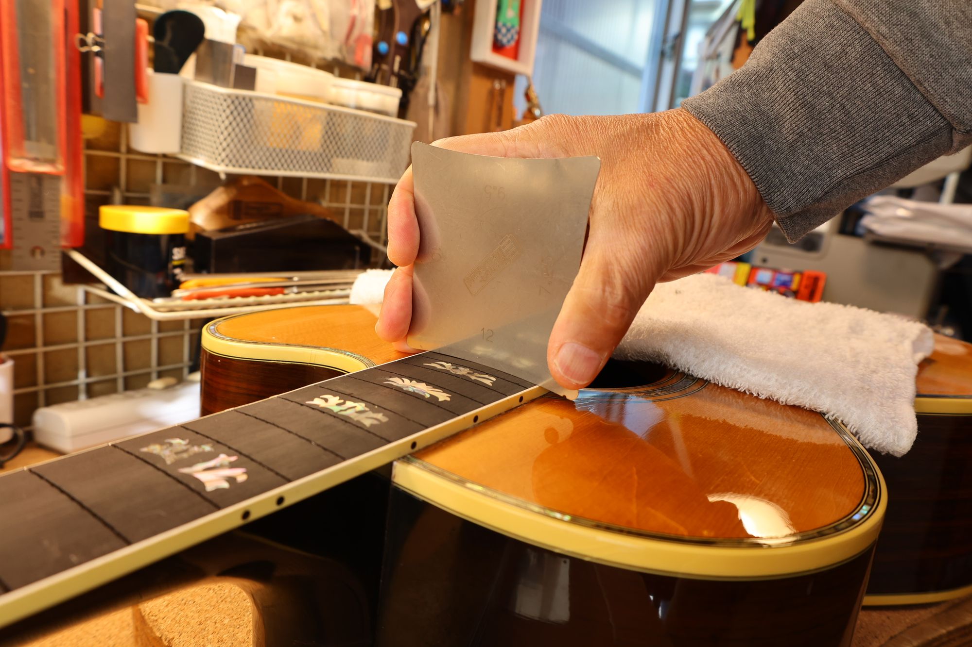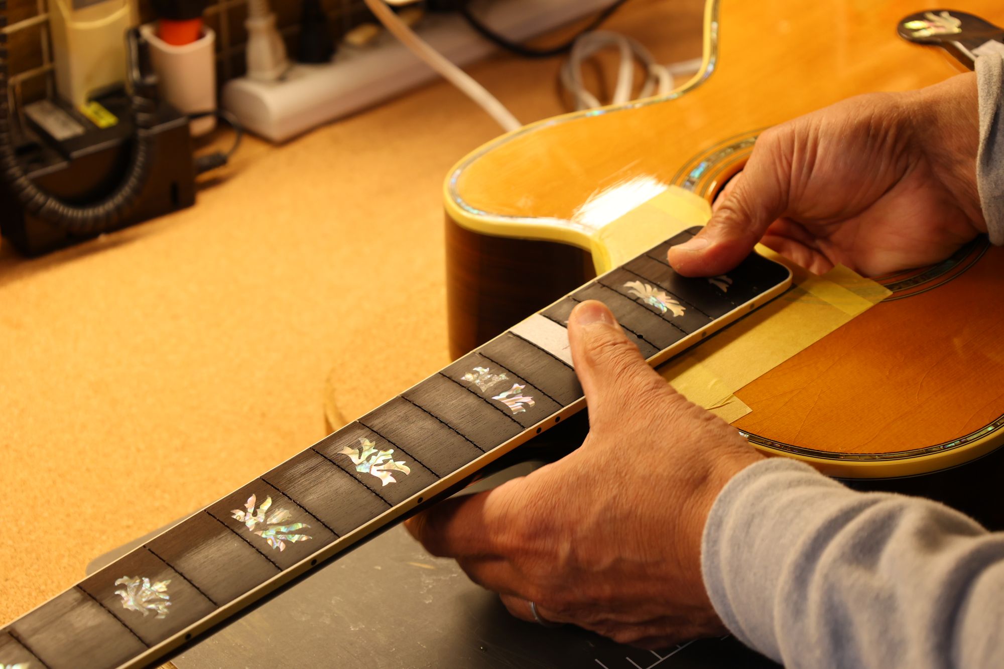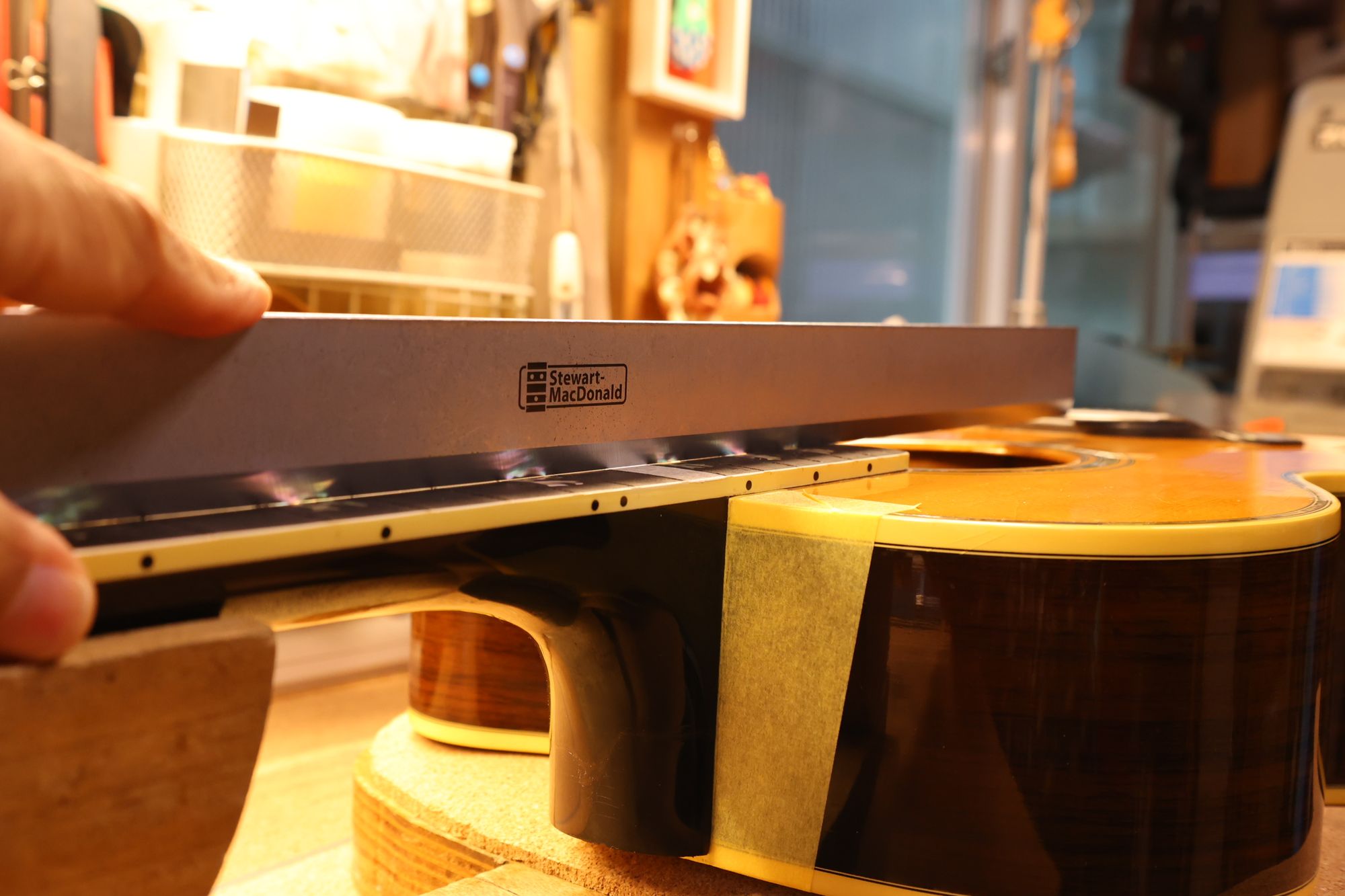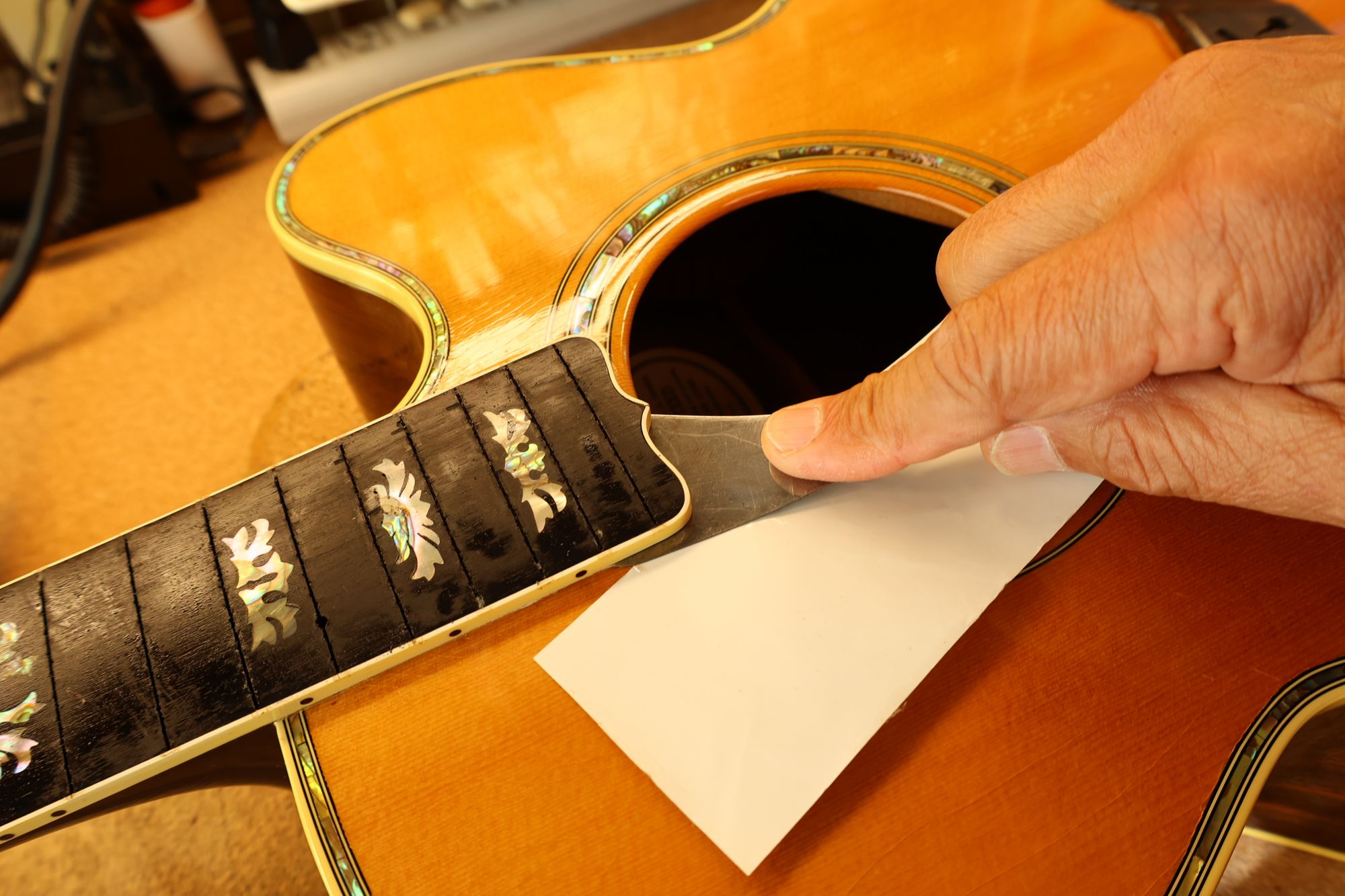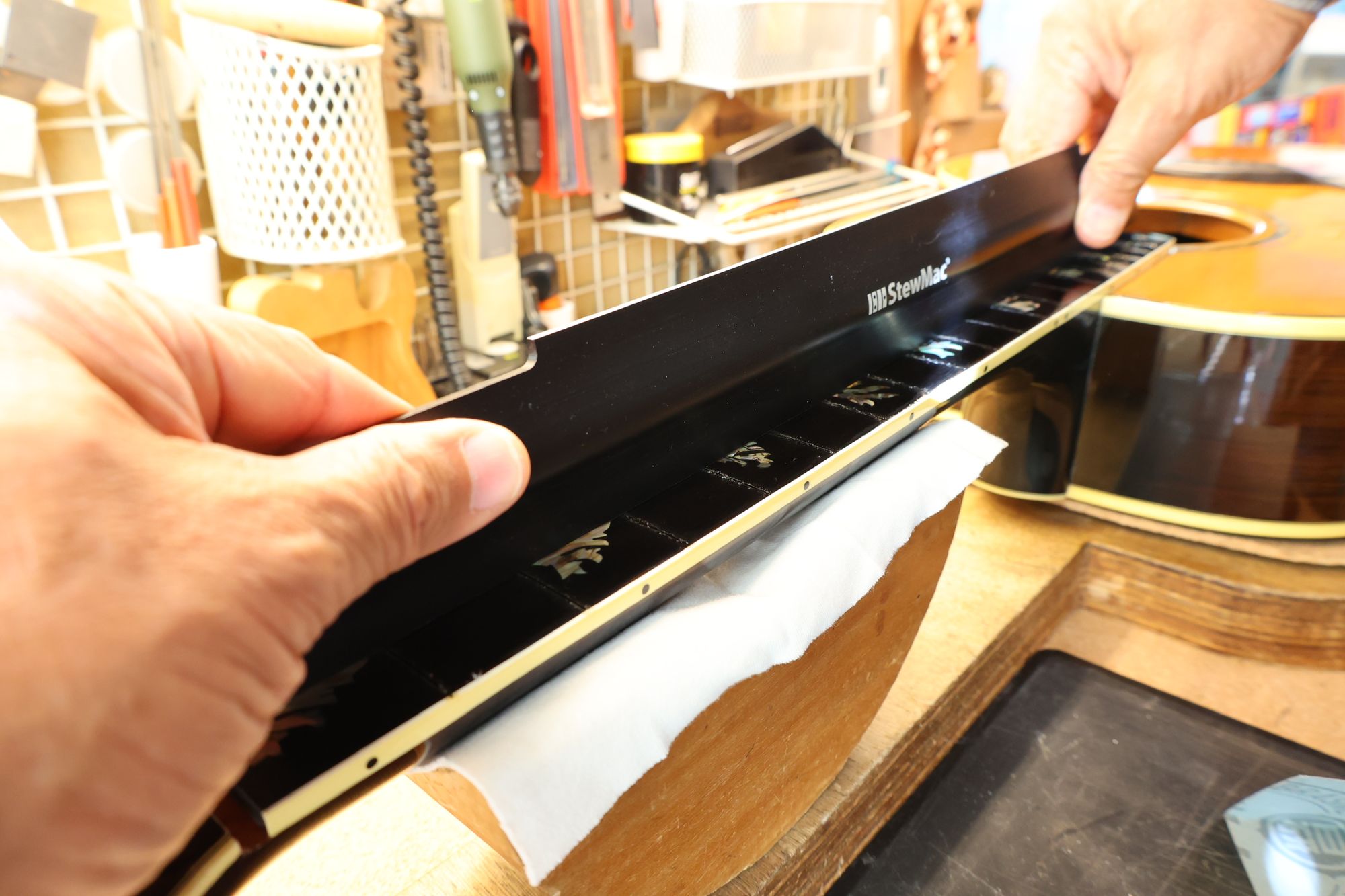 - 12.目視および指で触ってネック、フィンガーボードと段差のないことを確認しておきます。