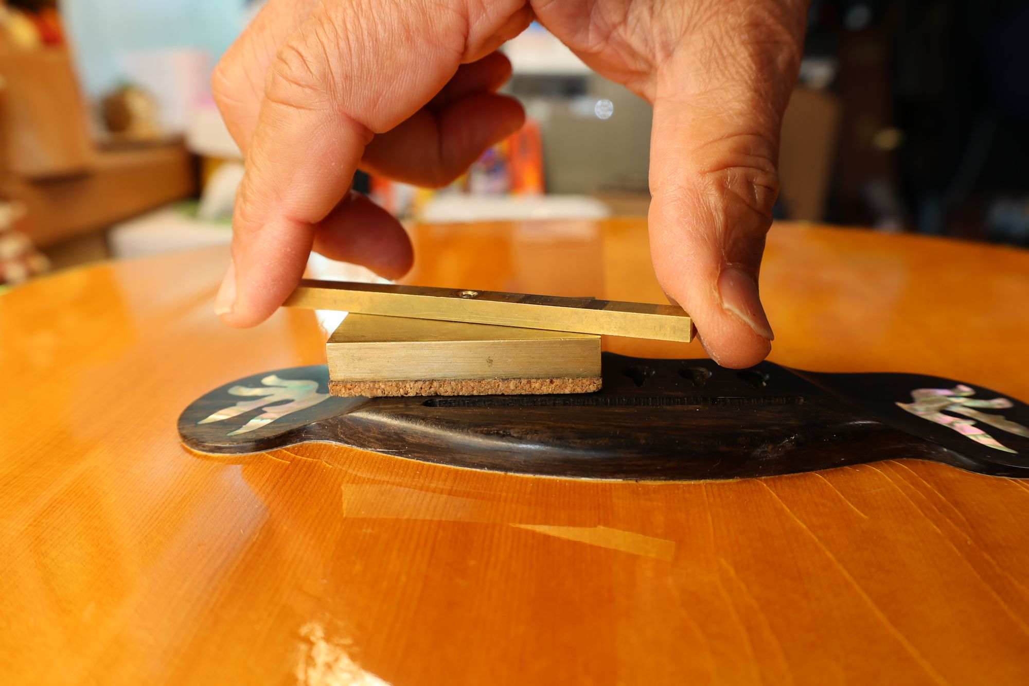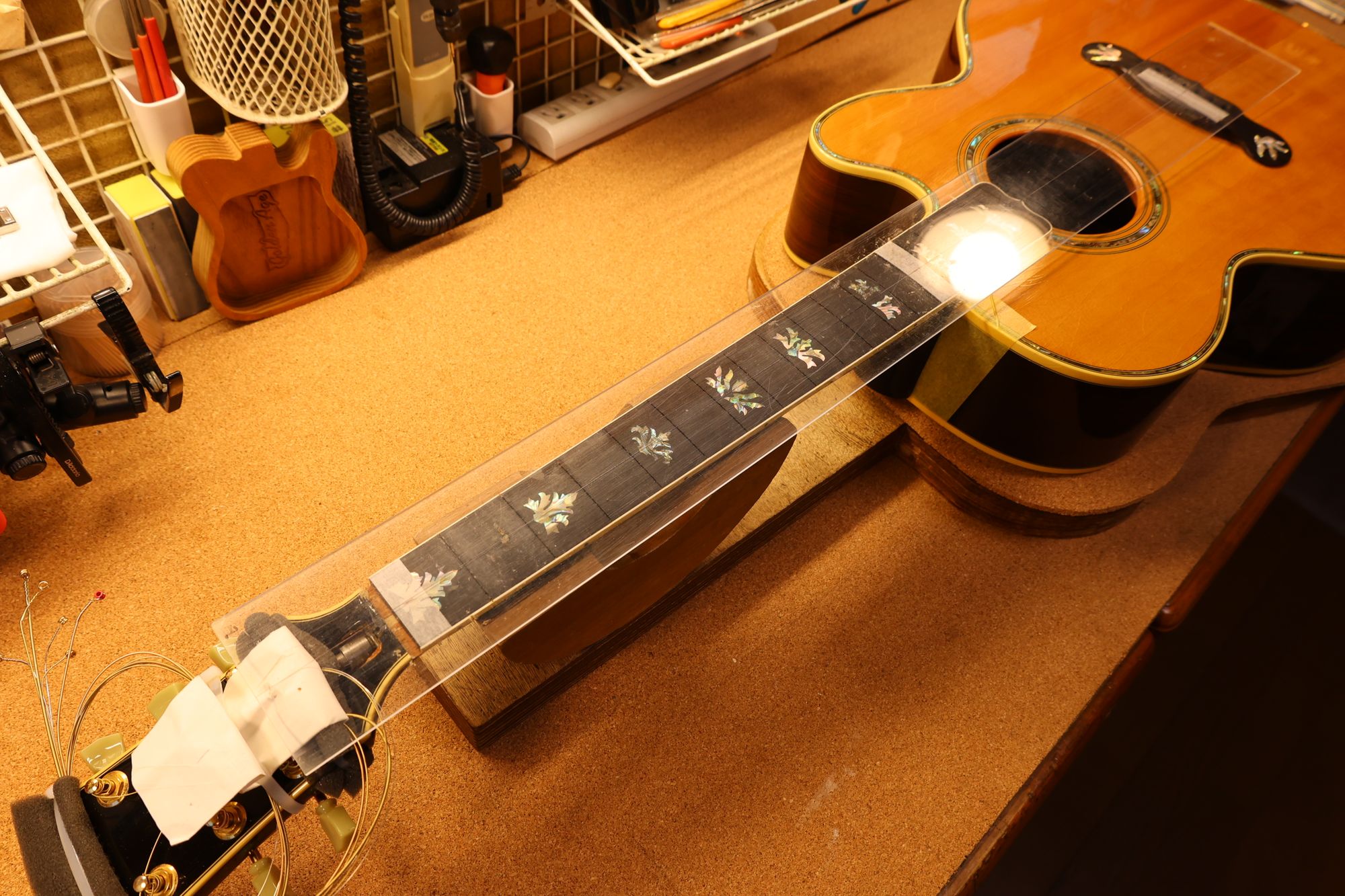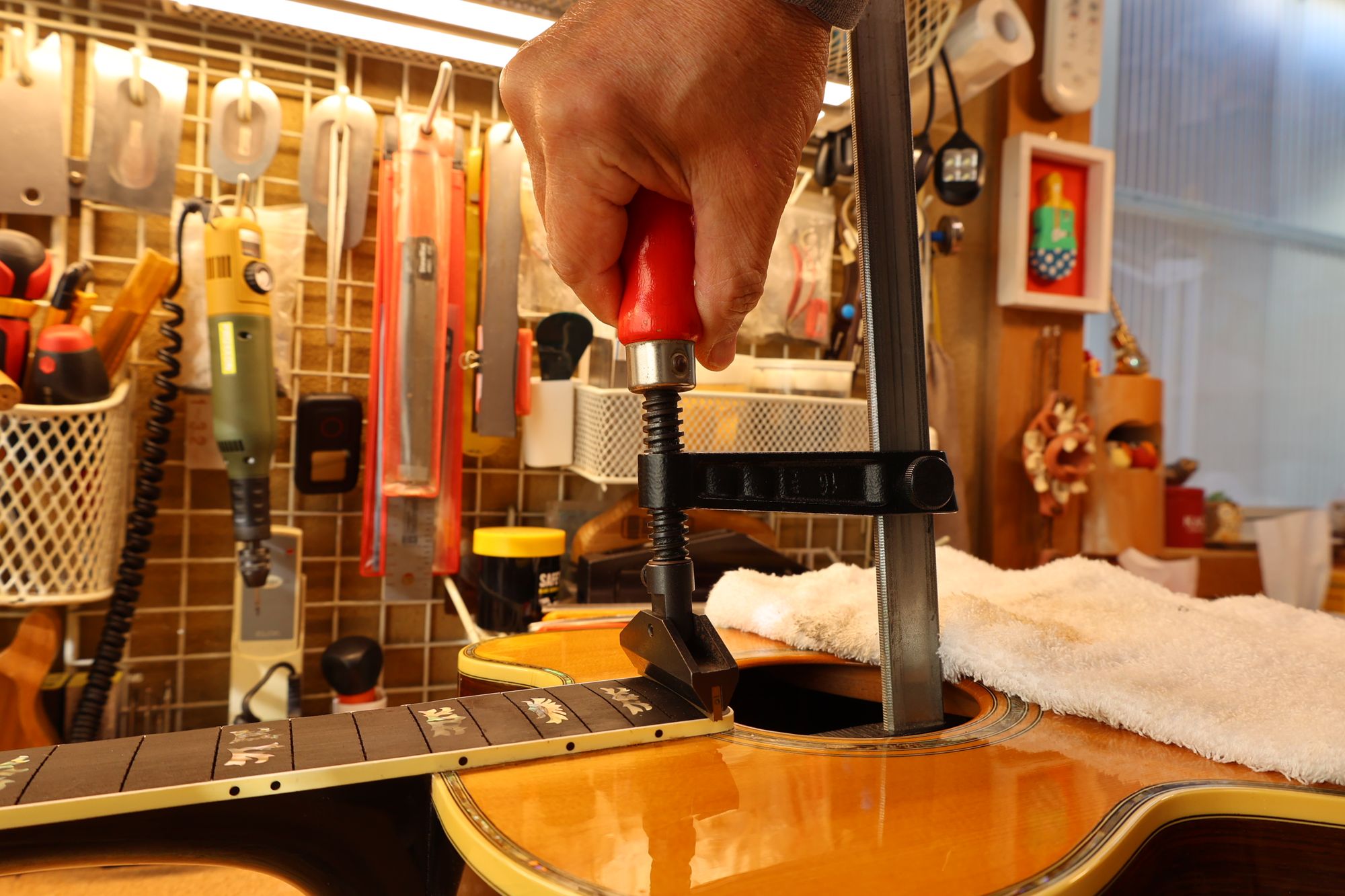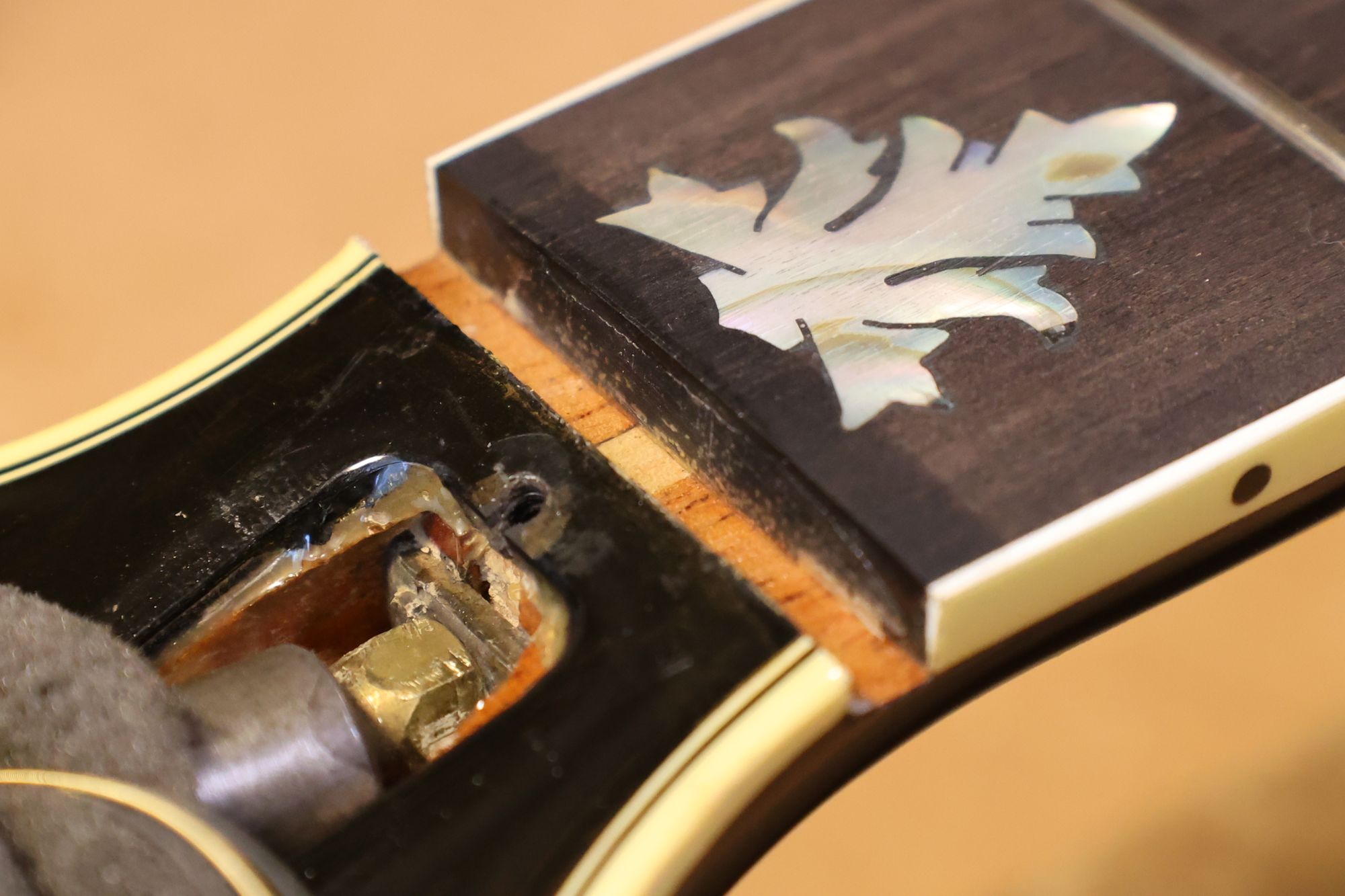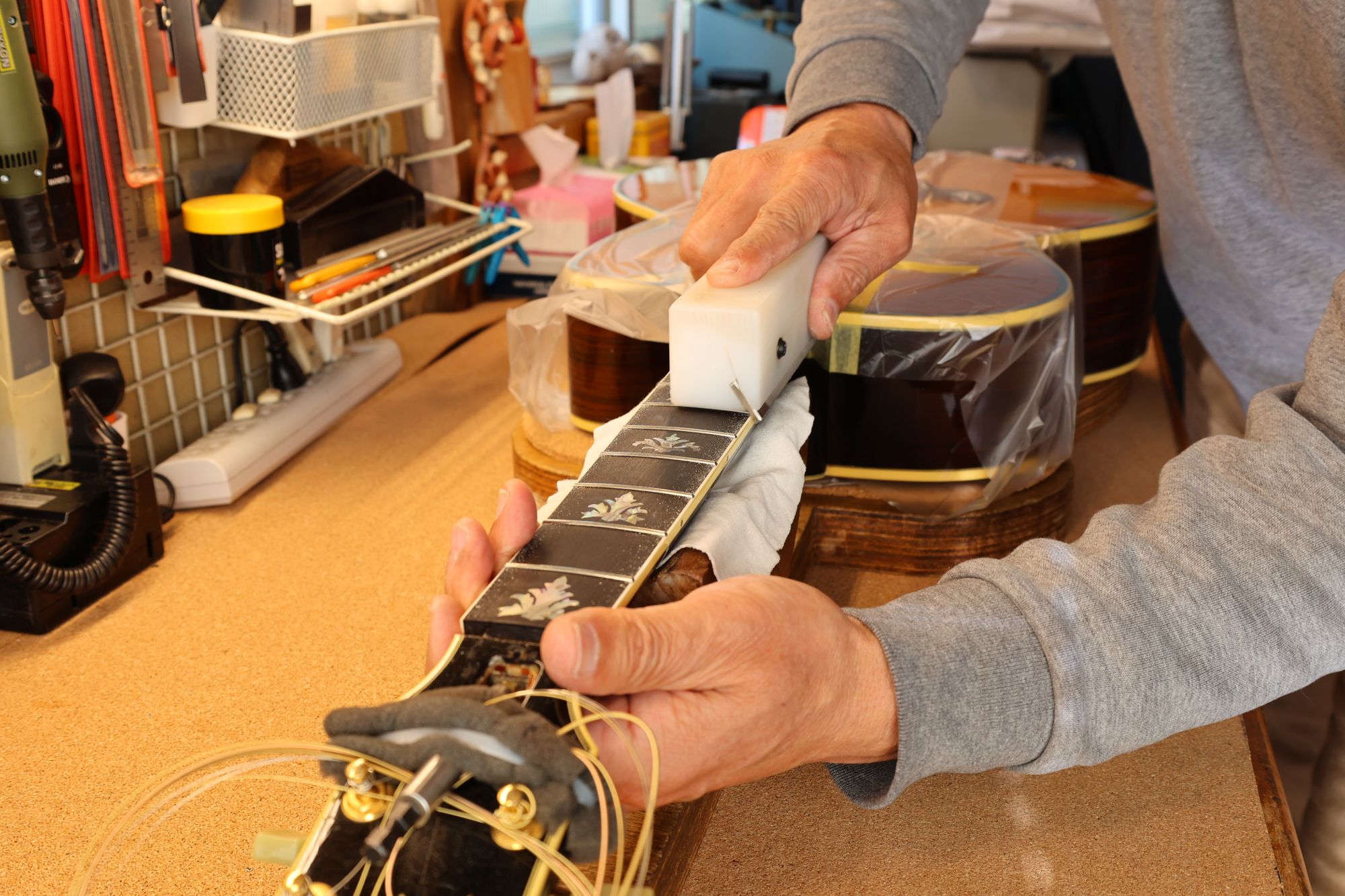 - 12.目視および指で触ってネック、フィンガーボードと段差のないことを確認しておきます。