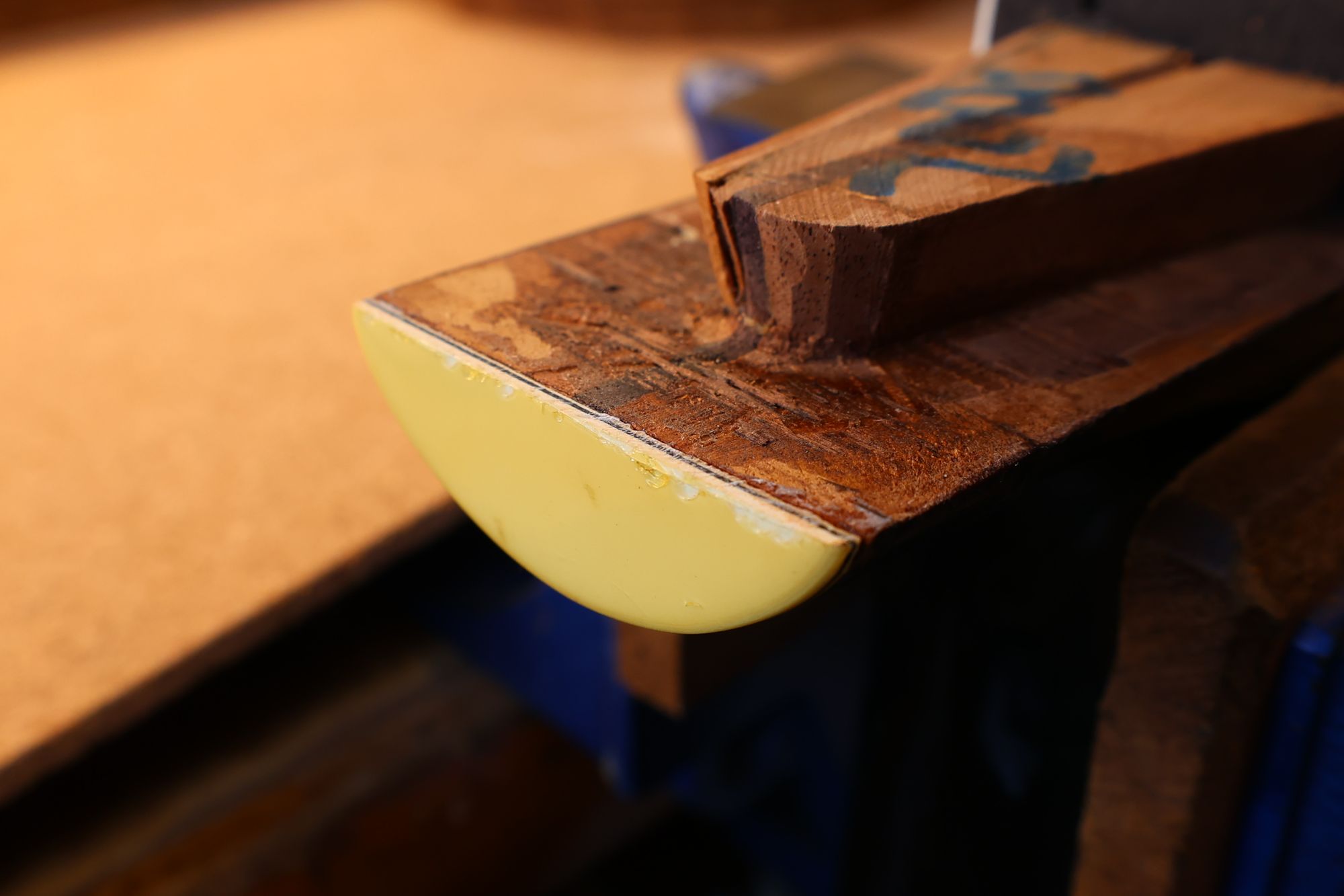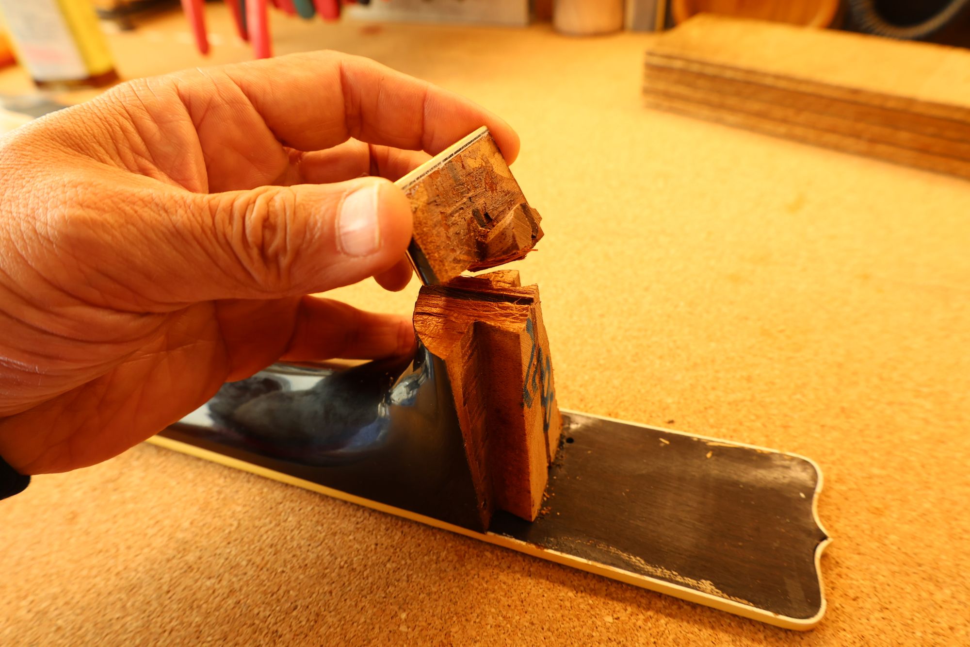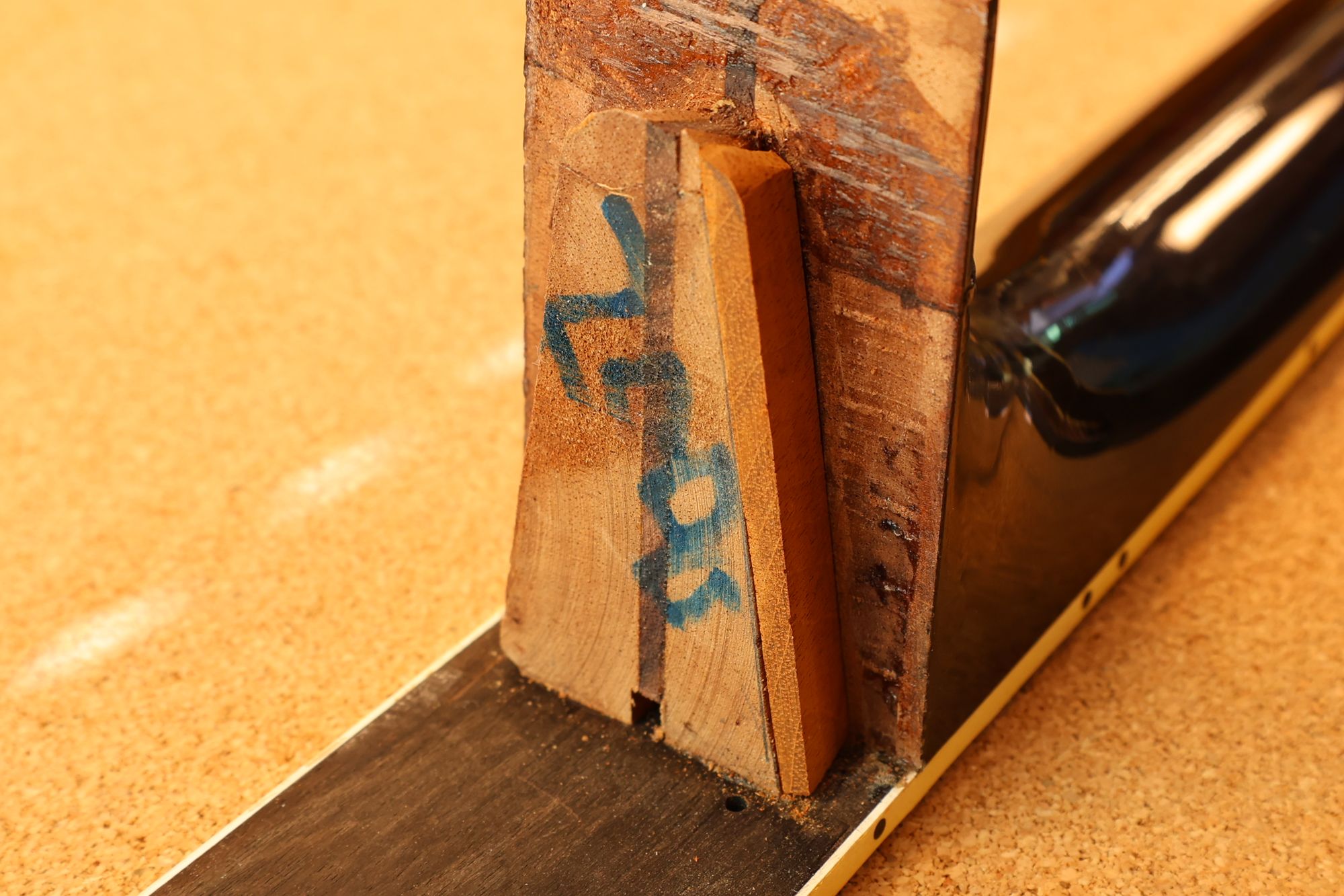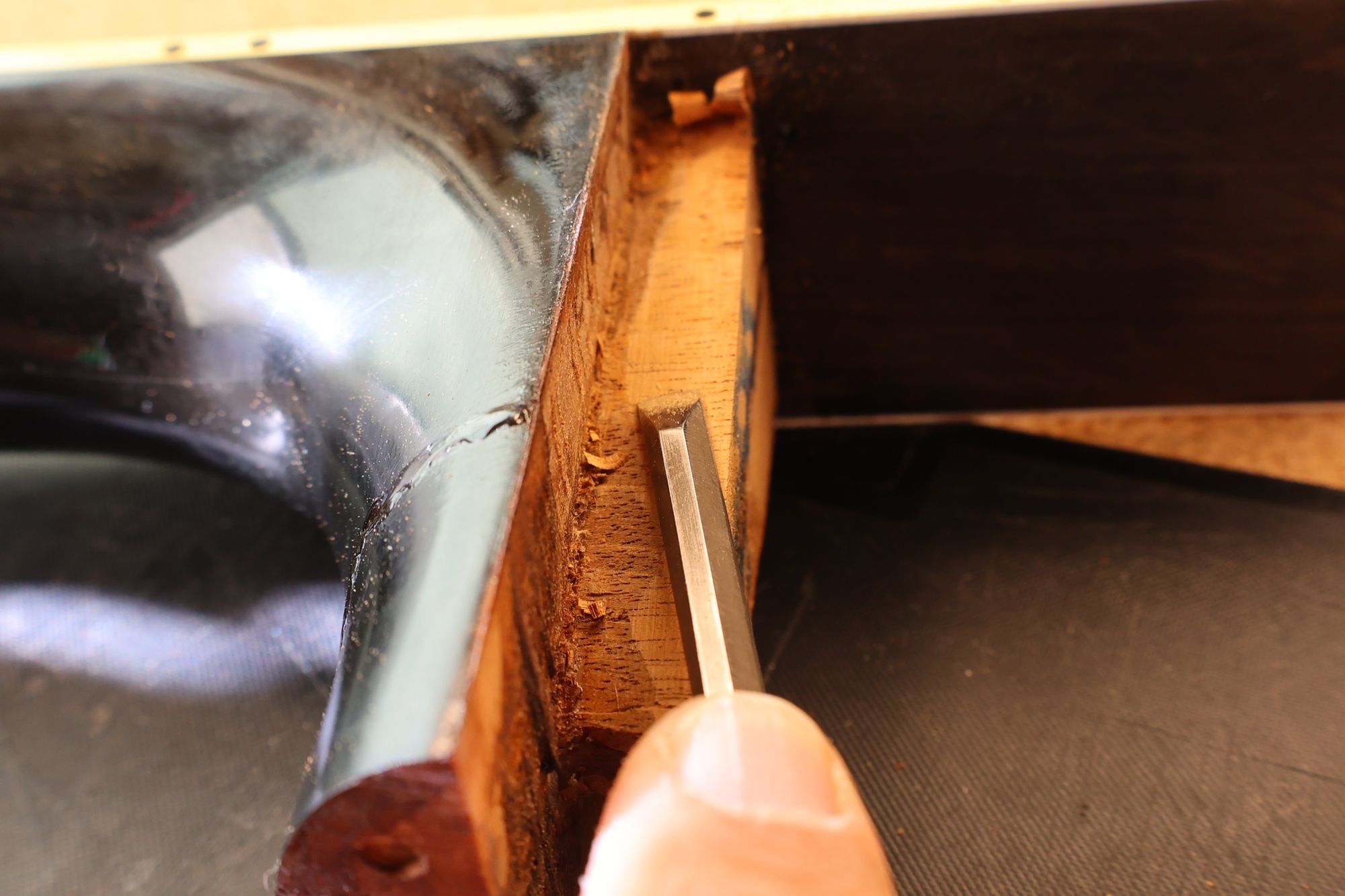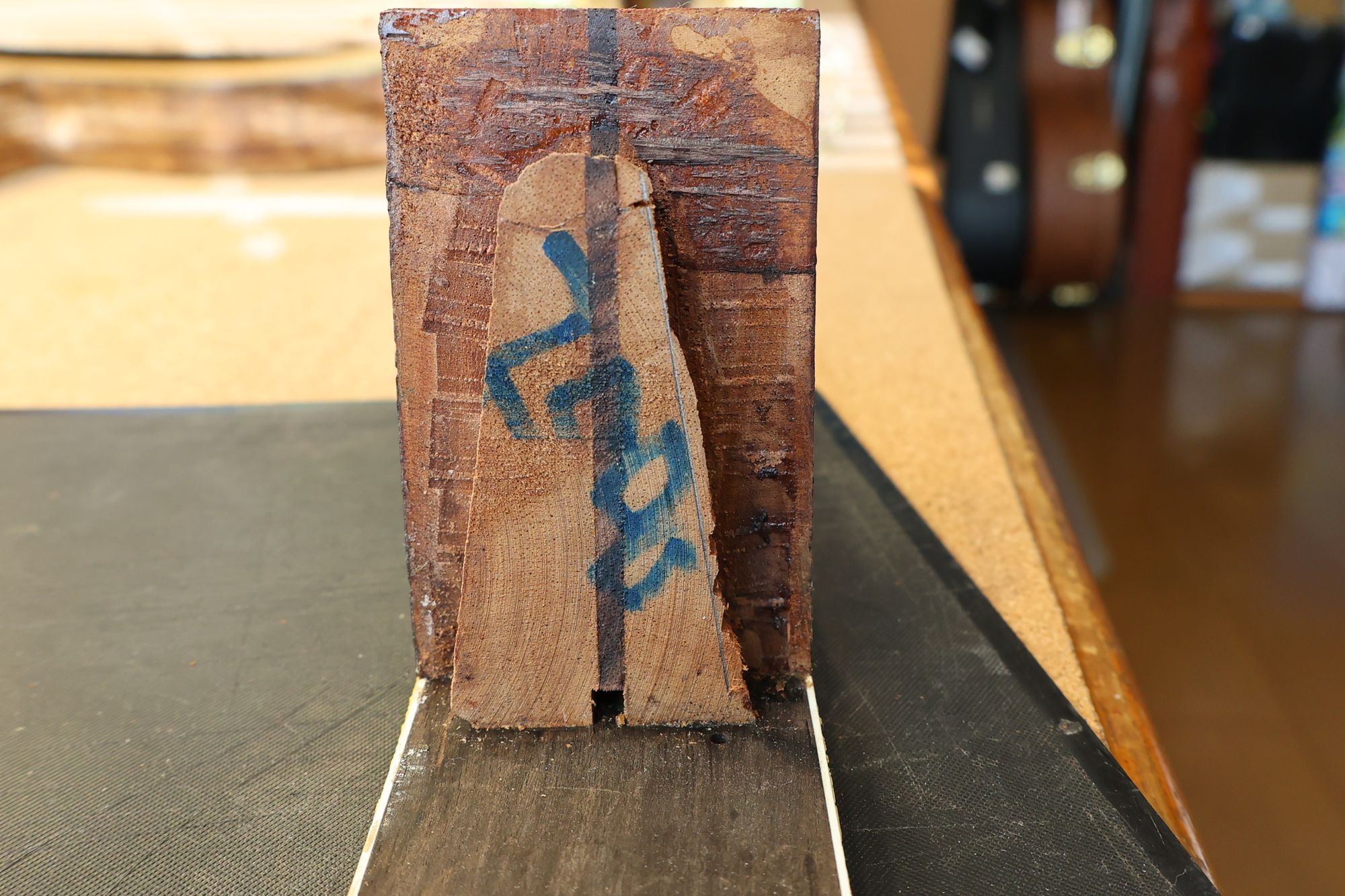 - 20.ジョイント部を本来の形状に戻すためにマホガニ材で補強します。最初に歪になったジョイント面を平坦にならします。
