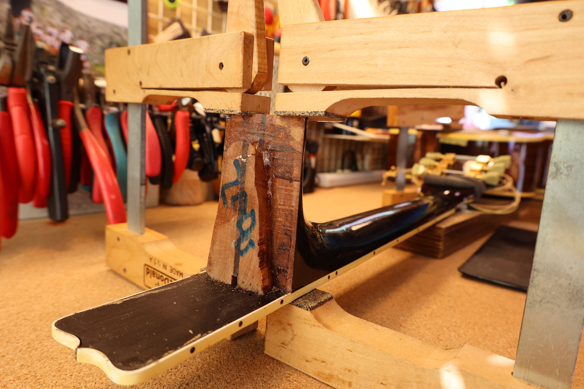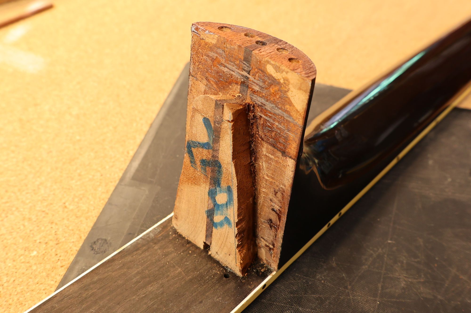 - 14.ヒール部修復を行いましょう。まず分離したネックの接着を行います。