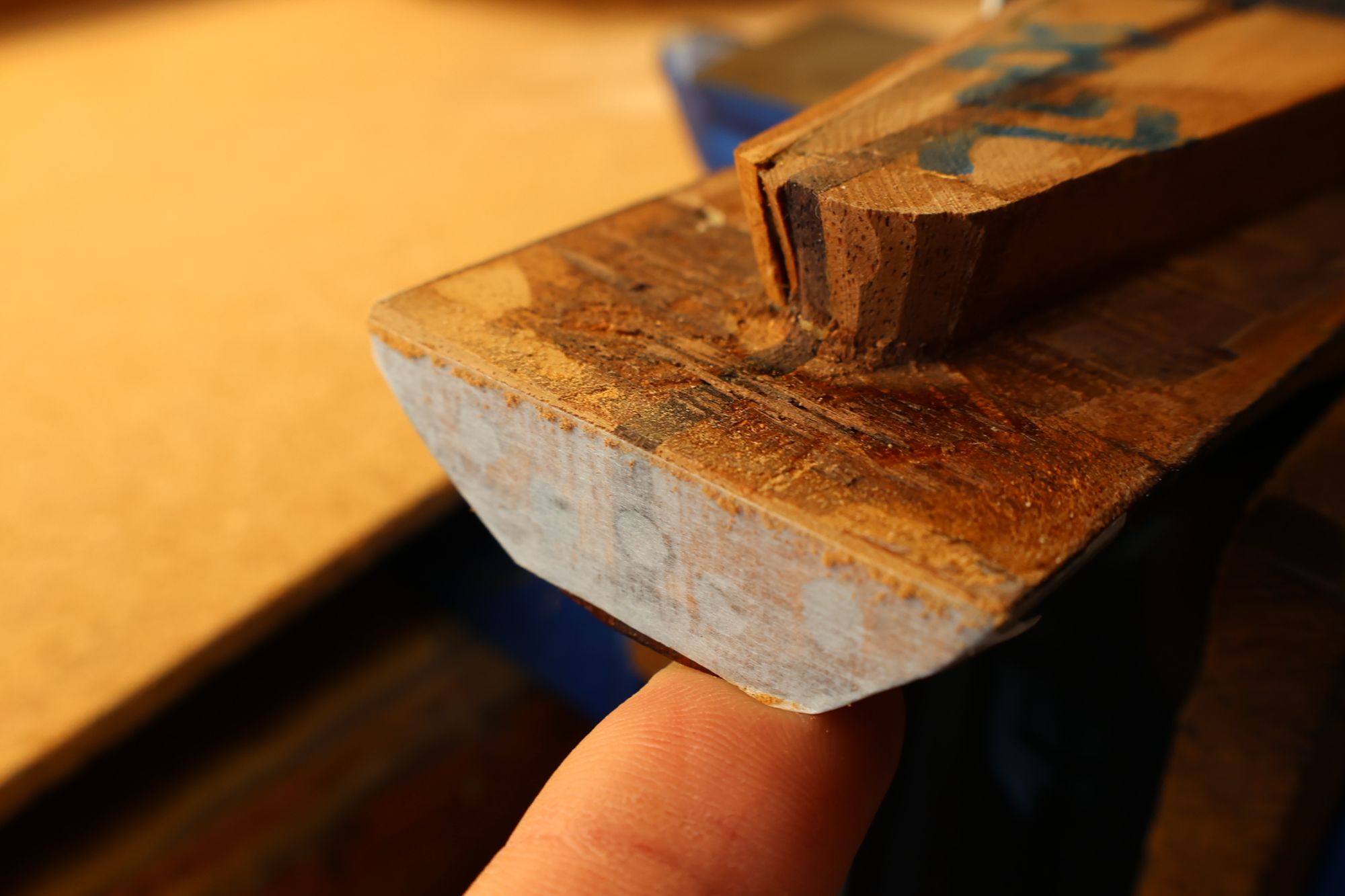 - 32.ネック接合部を削っていきます。フィンガーボード側(右)は削らず、ヒール部(左)だけに傾斜を持たせるように加工していきます。
