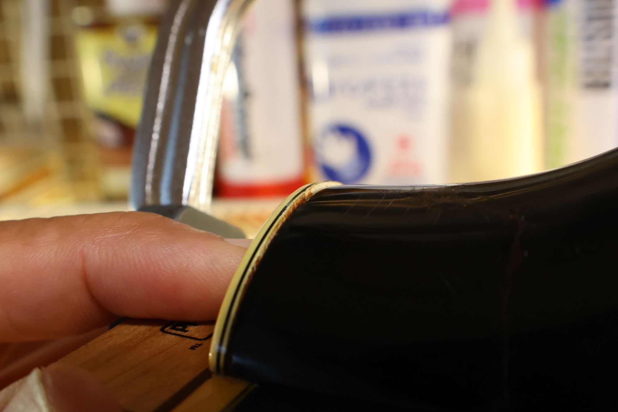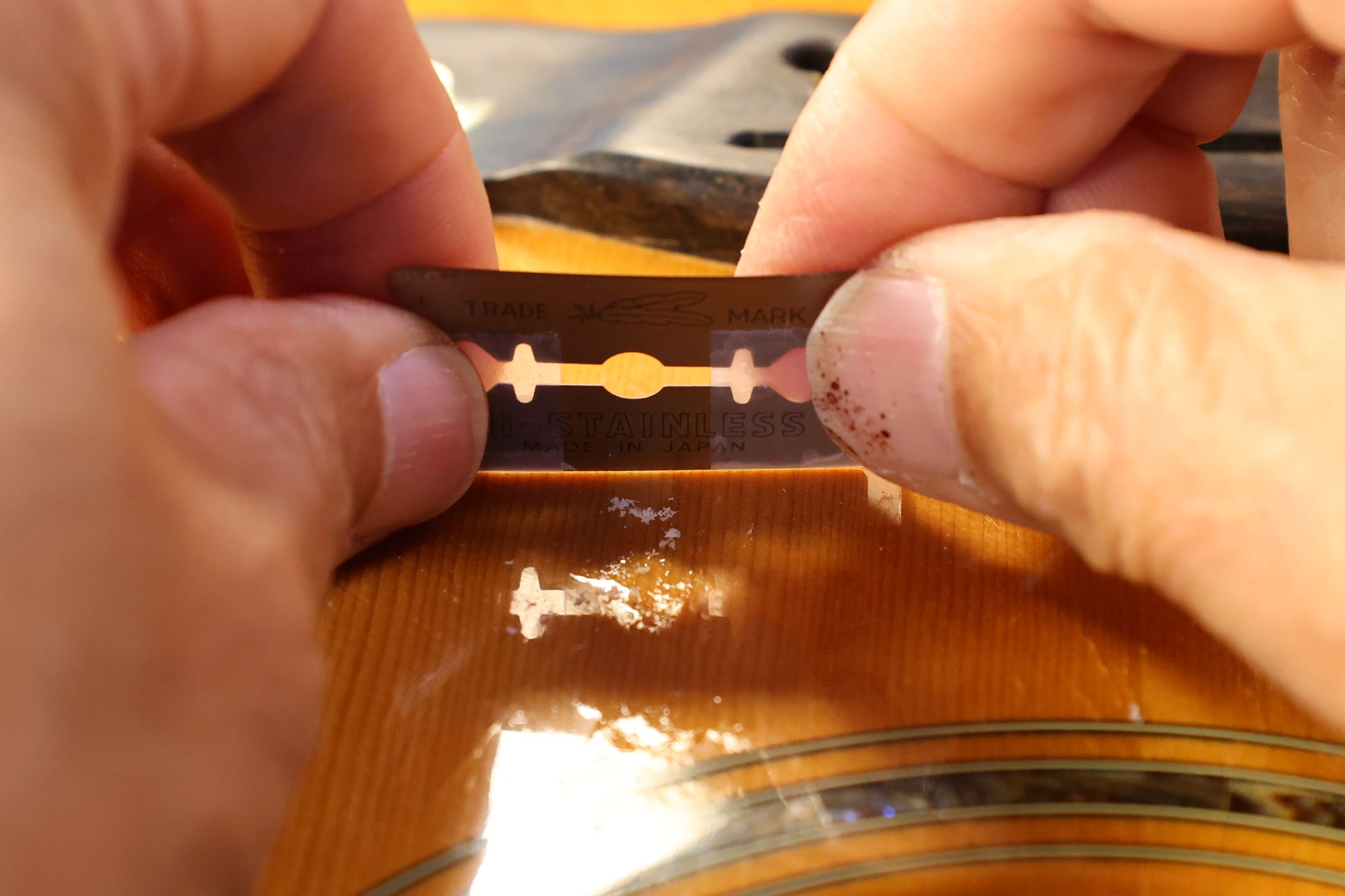 - 28.ネック側にも接着剤が残っていますので、クリーニングします。