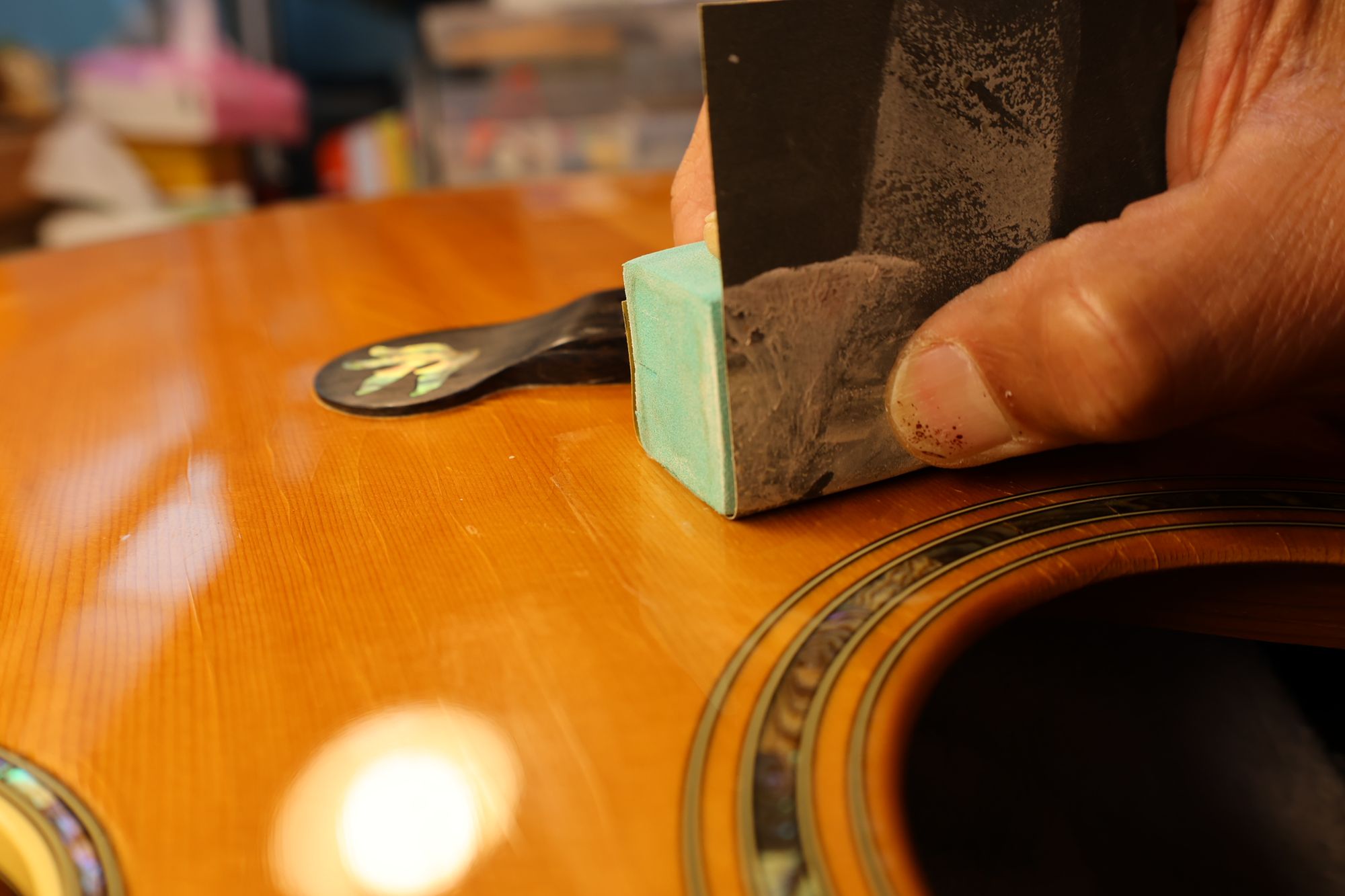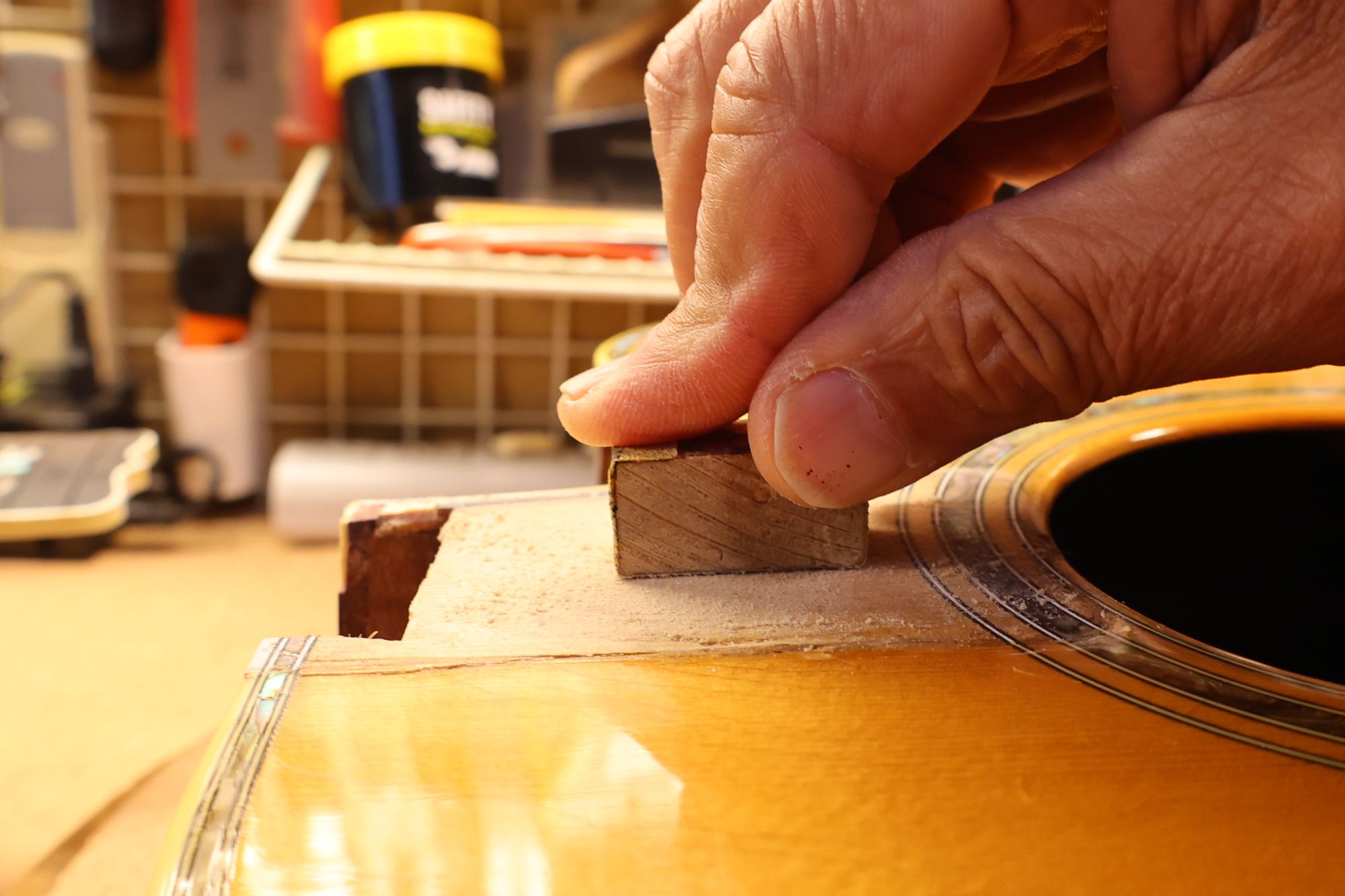 - 35.ボディとフィンガーボード接合部をサンディングブロックで平坦にしておきます。