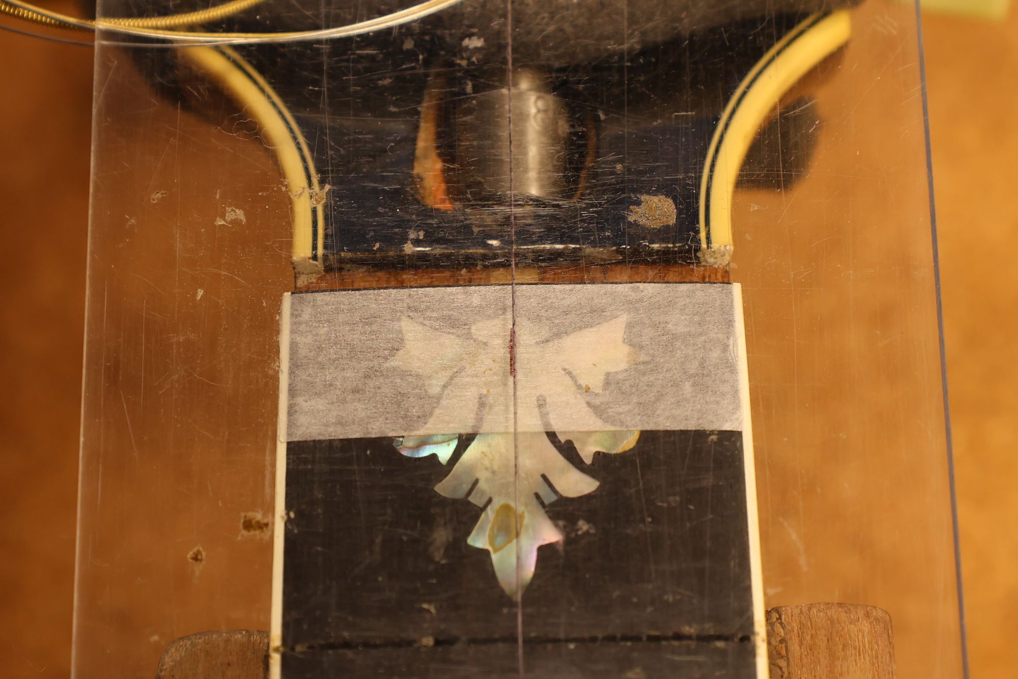 - 1.サウンドホールにチューナー、サドル位置にイントネーターを取り付けました。