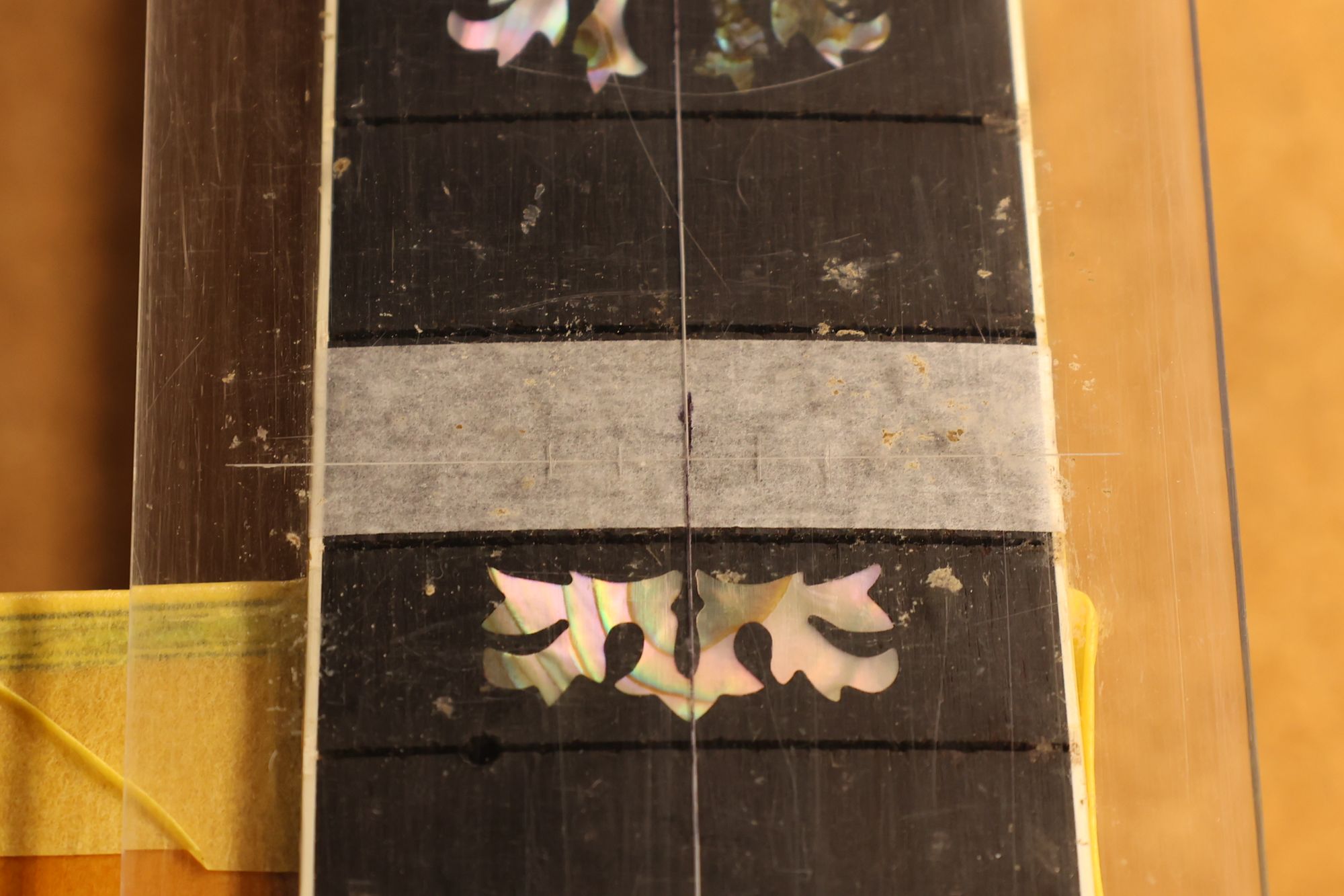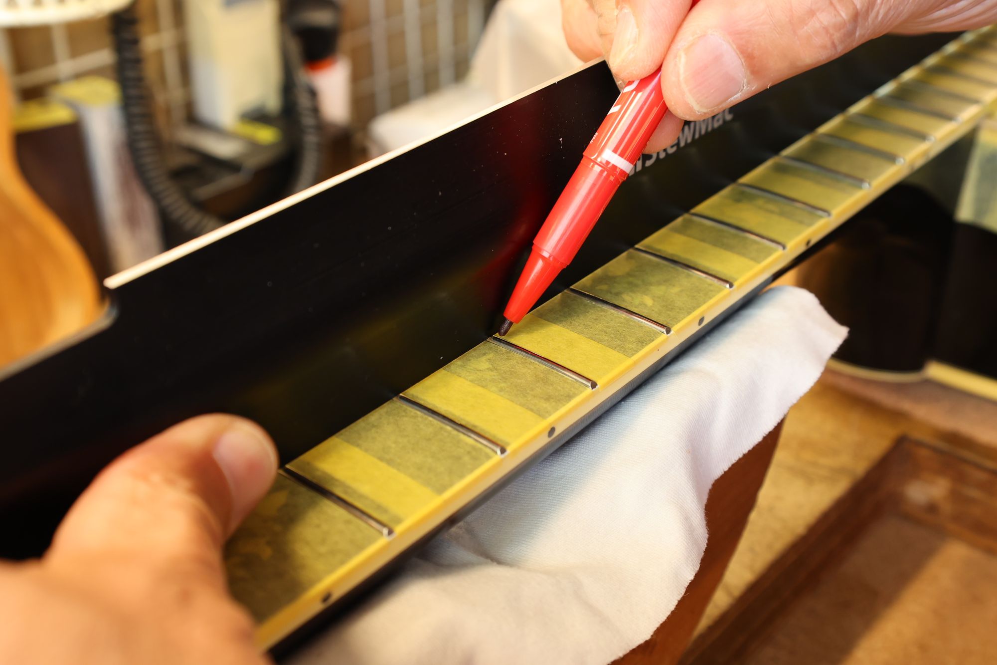 - 37.直定規を乗せて、フレット山が凹んでいる箇所にマークを入れます。