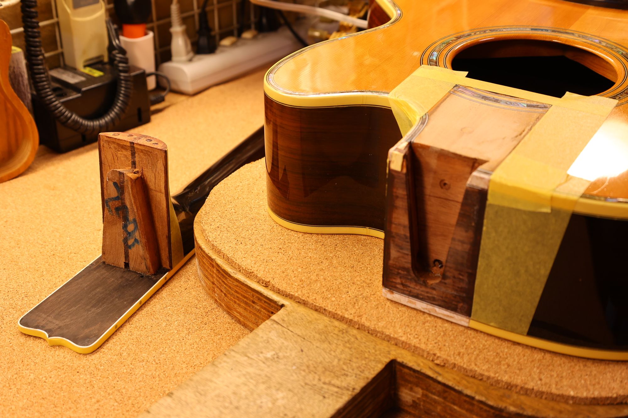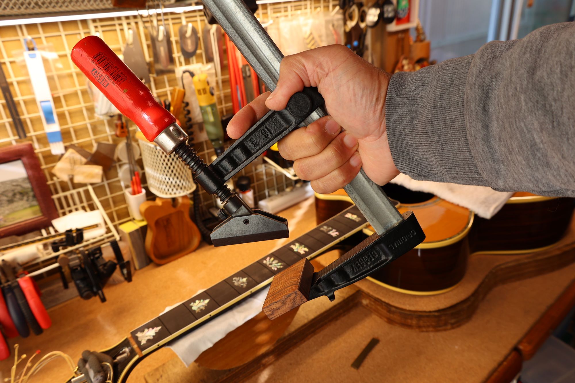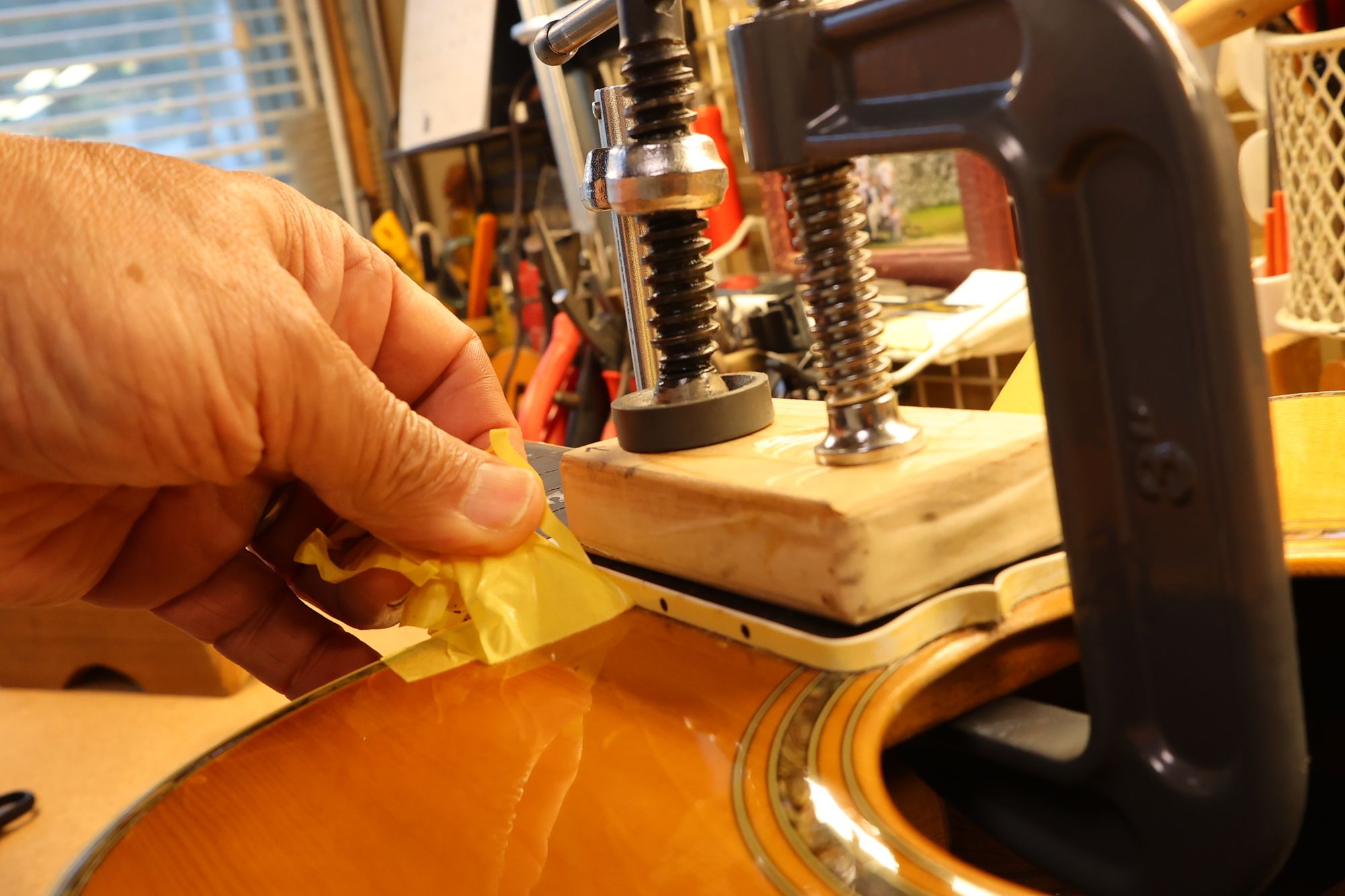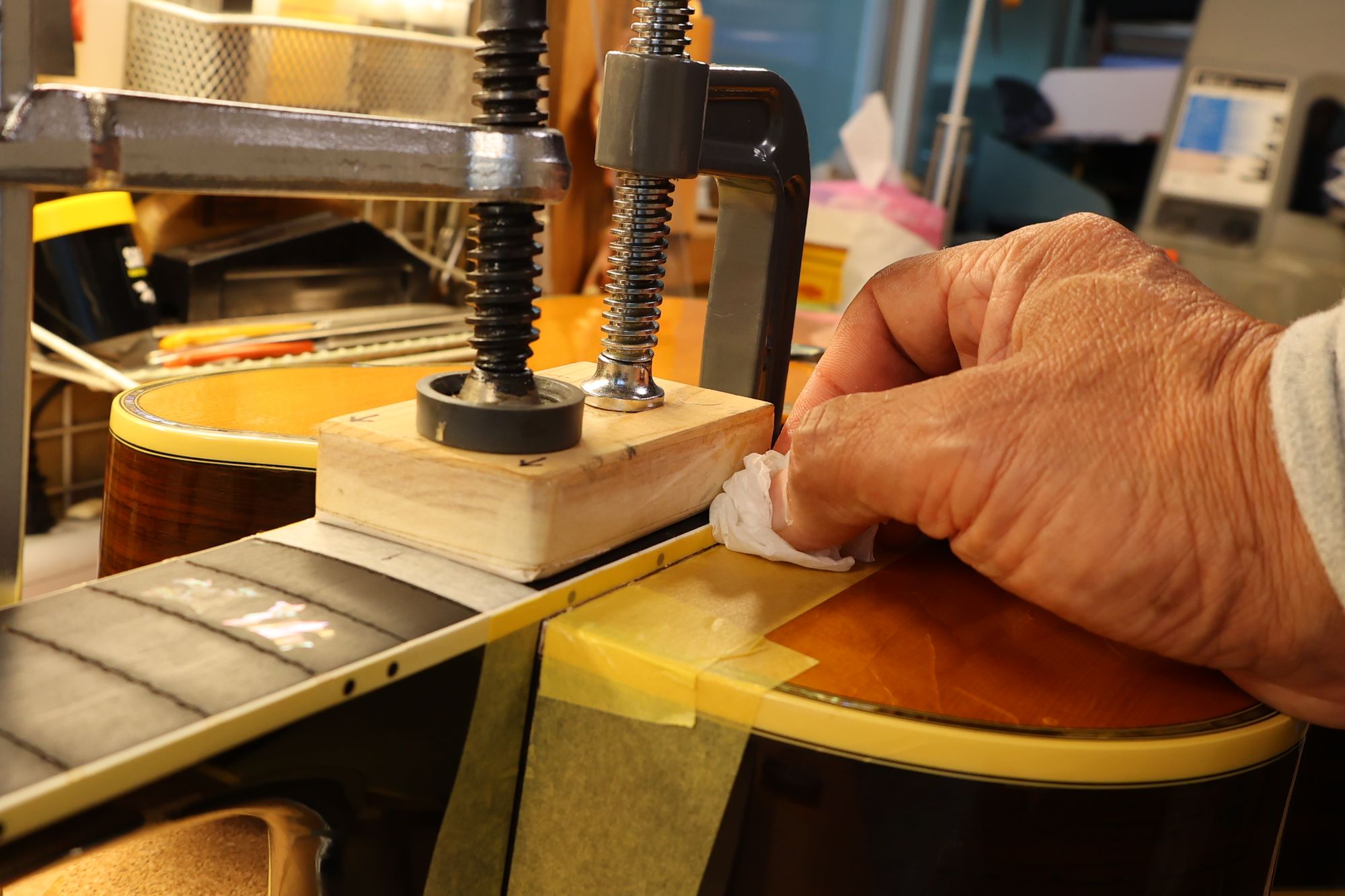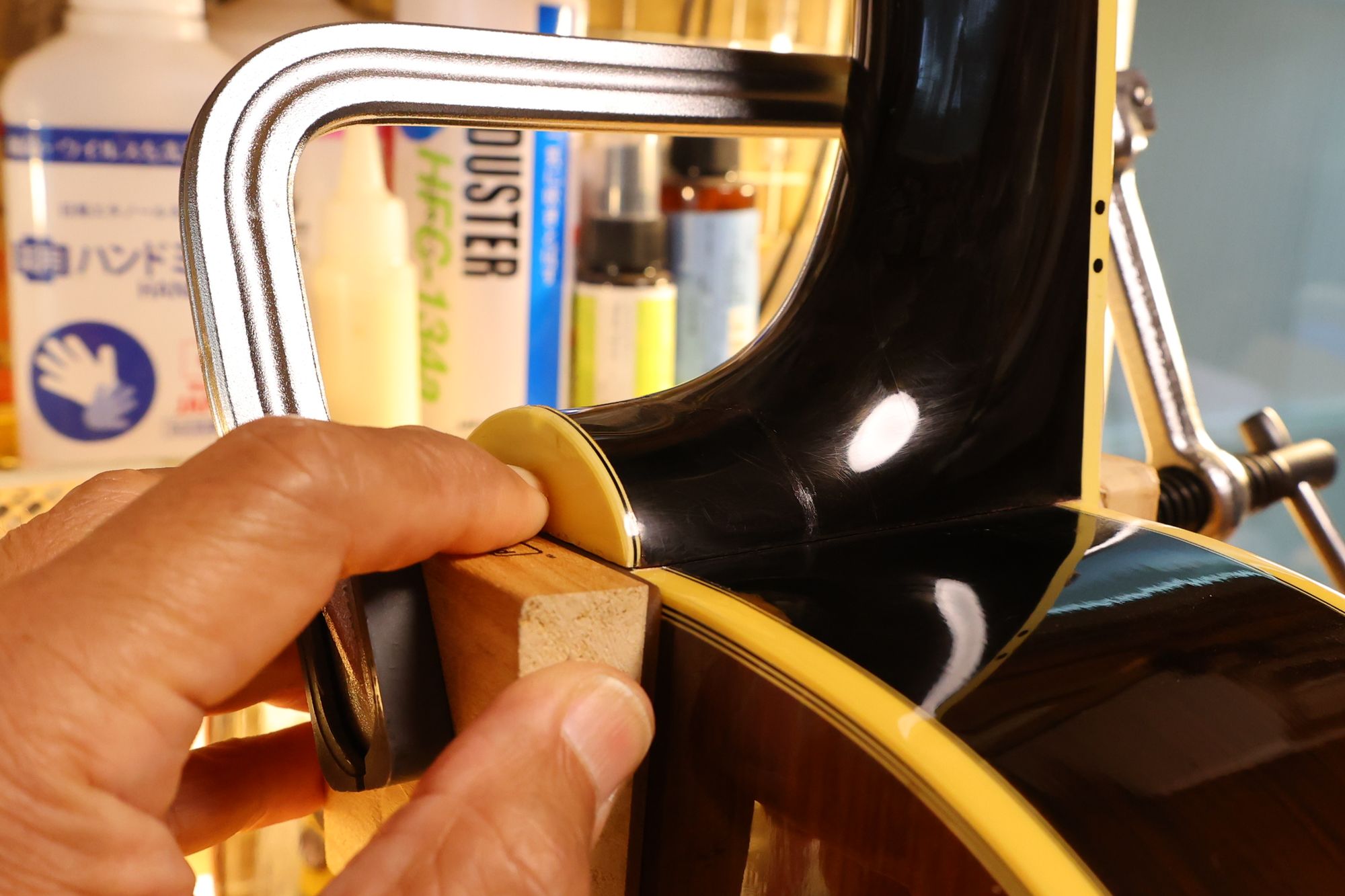 - 50.クランプと当て木でネックを固定し、あふれ出た接着剤をふき取っていきます。