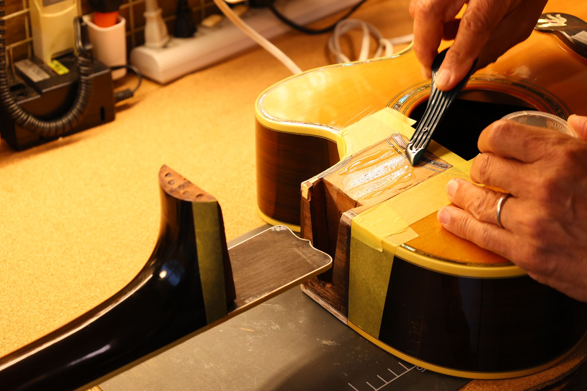 - 47.HideGlue(膠:ニカワ)をフィンガーボード裏とネック接合部に塗っていきます。