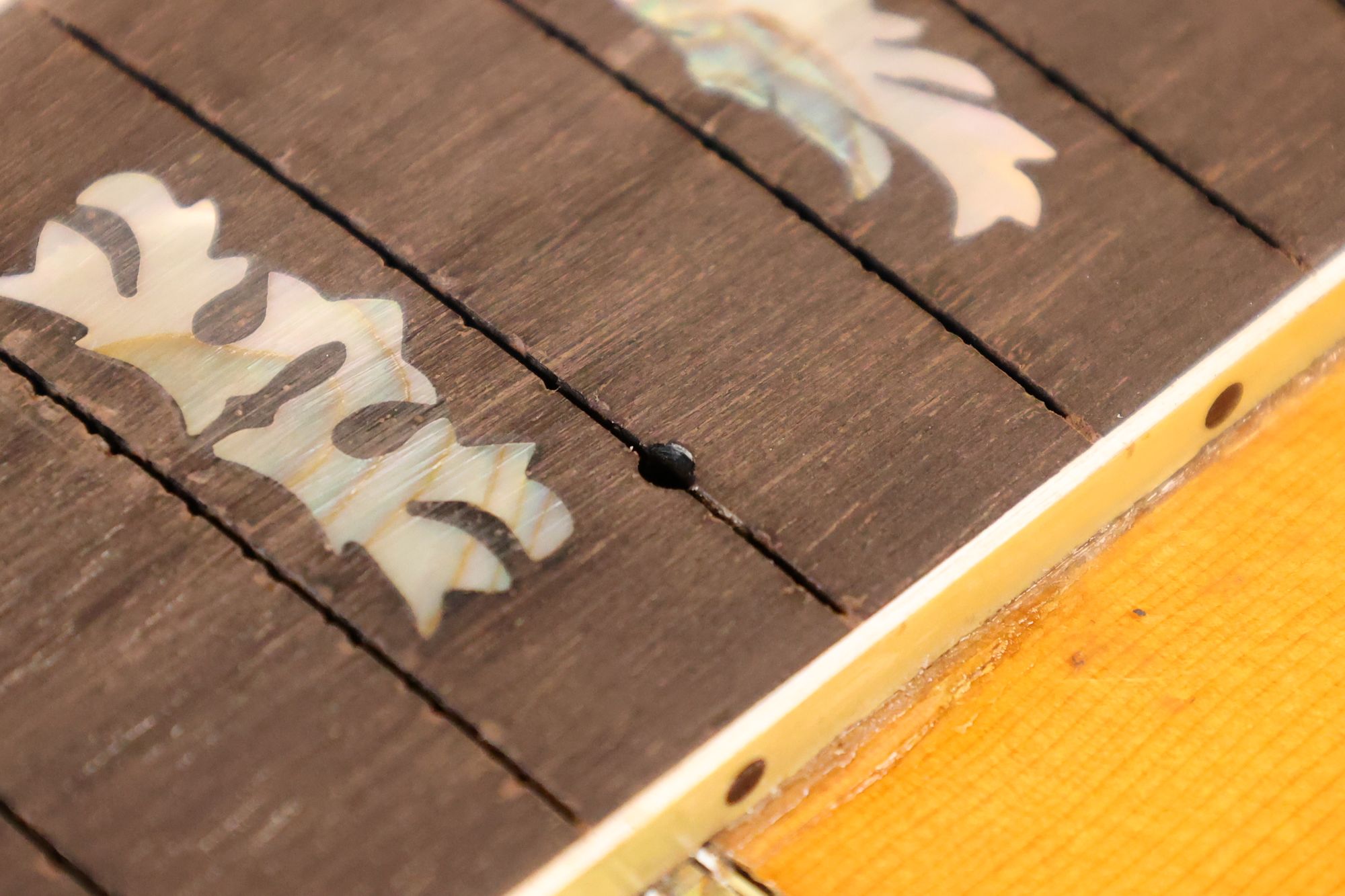 - 3.フレット交換の前にフィンガーボードにあけた穴を元に戻しましょう。穴径にあうようにエボニー片を丸く削ります。