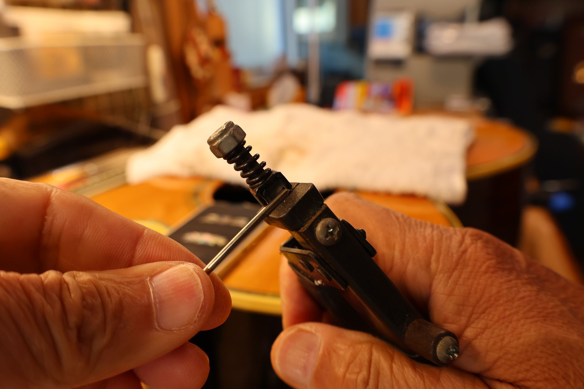 - 16.1弦のプレート凹み部分にプラグを接着しました。小ネジは少し引き上げてプラグを固定した後、緩めとります。