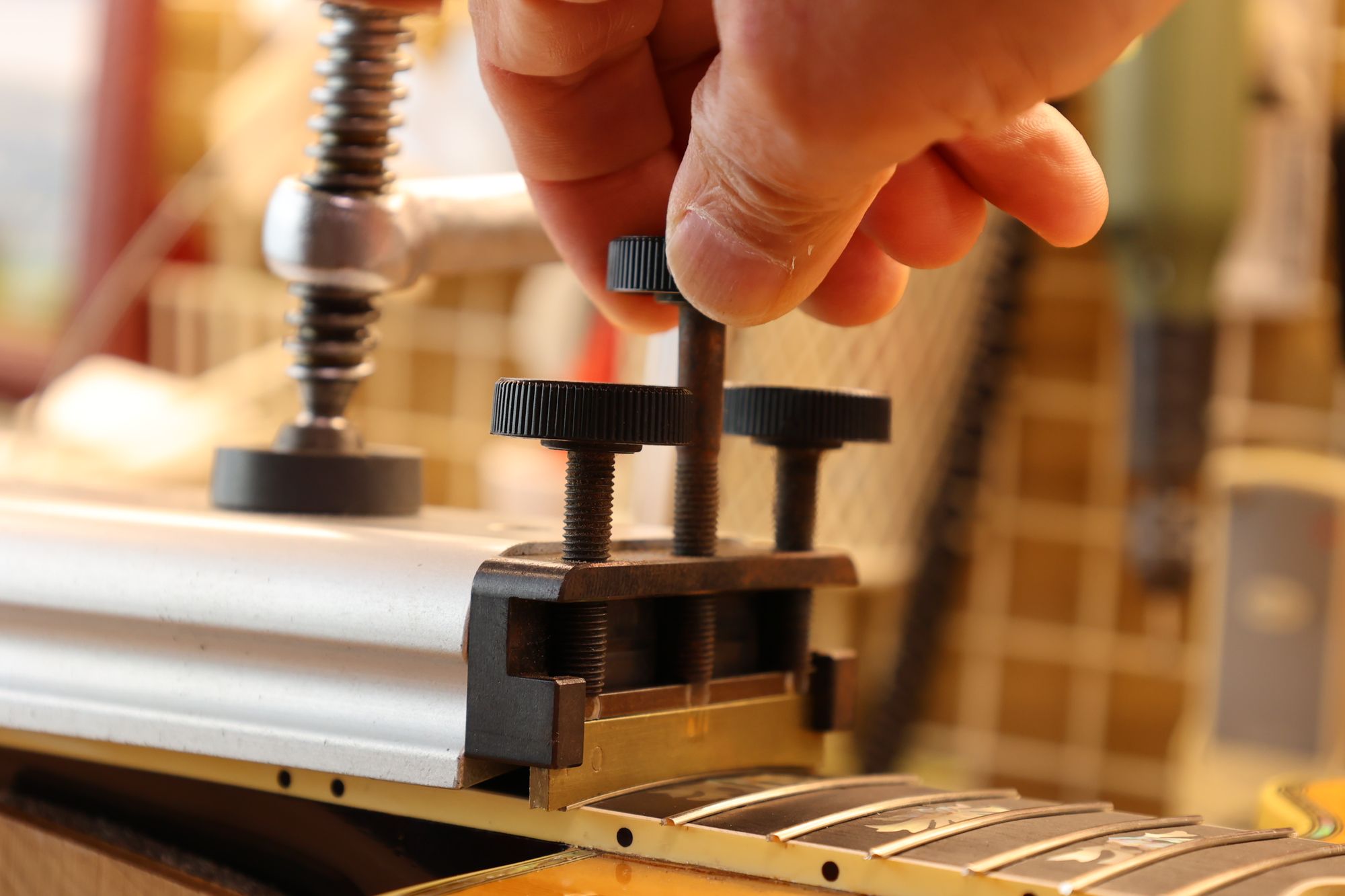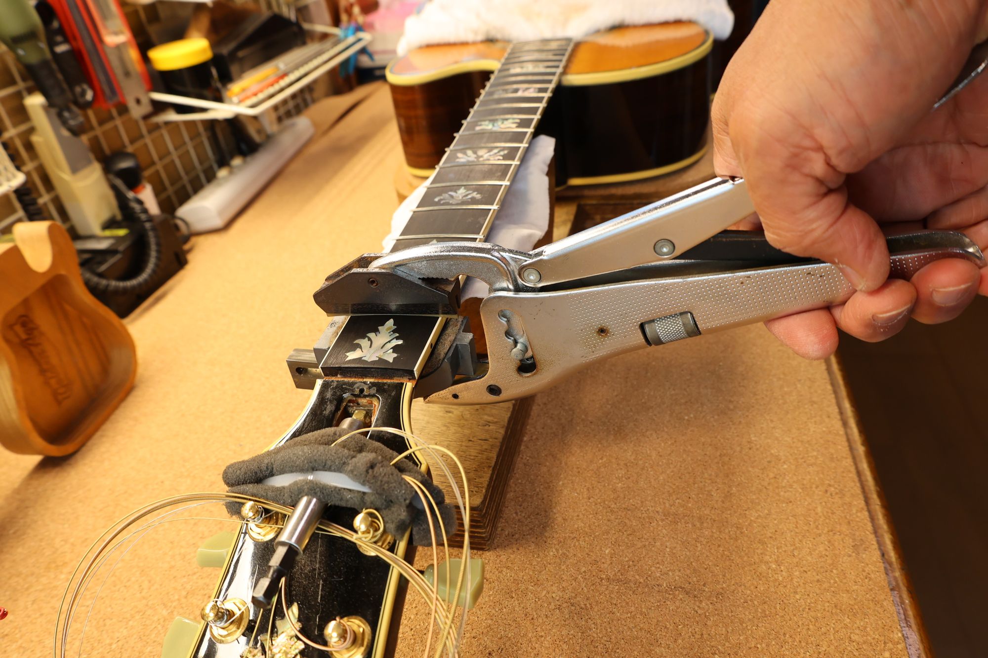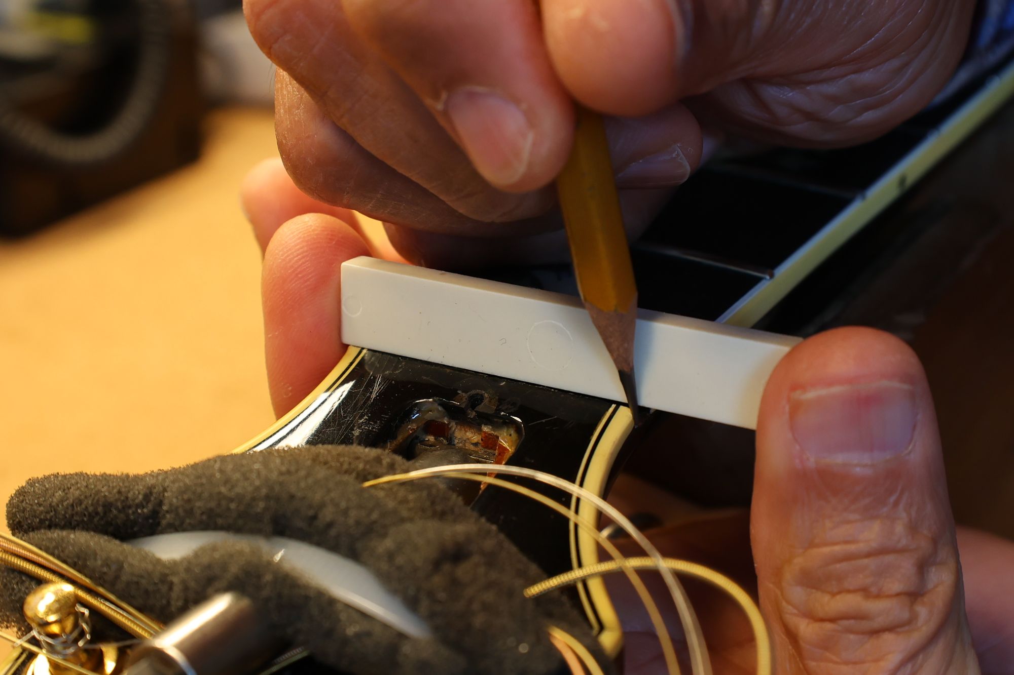 - 22.ストリングリフターで弦を待避させて、ナット溝を徐々に下げていきます。