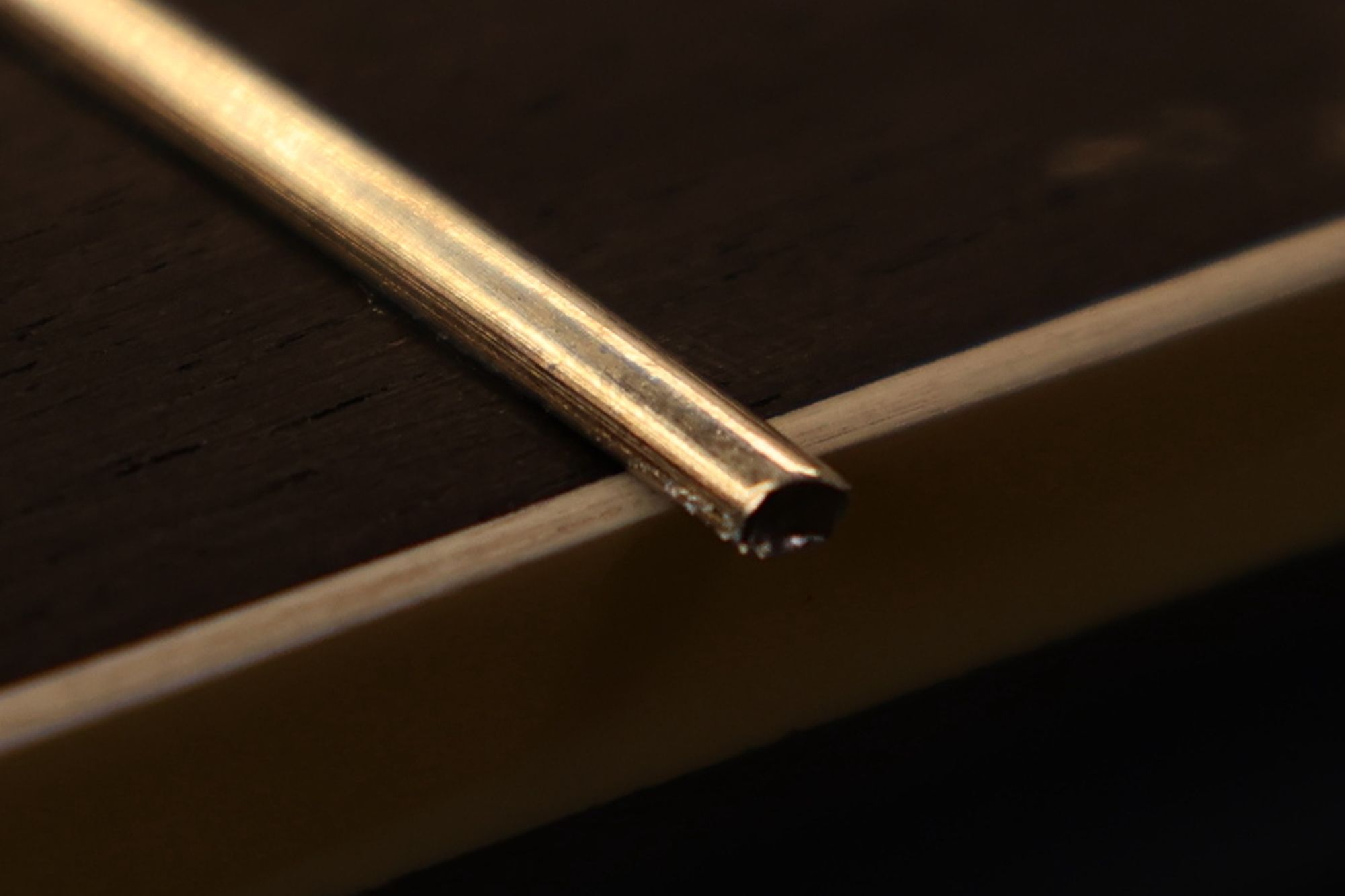 - 4.ドリル穴にエボニー材を押し込み、フィンガーボードを傷つけないように出た部分をカットします。