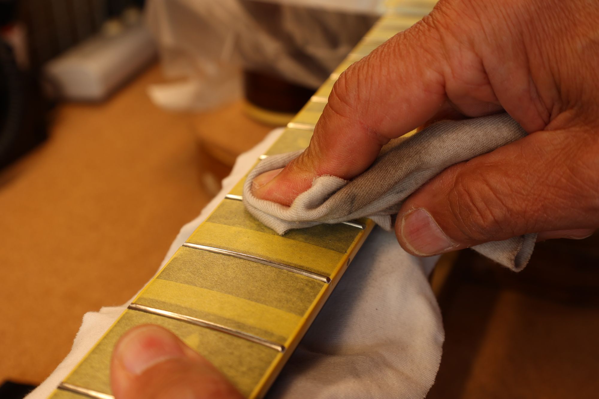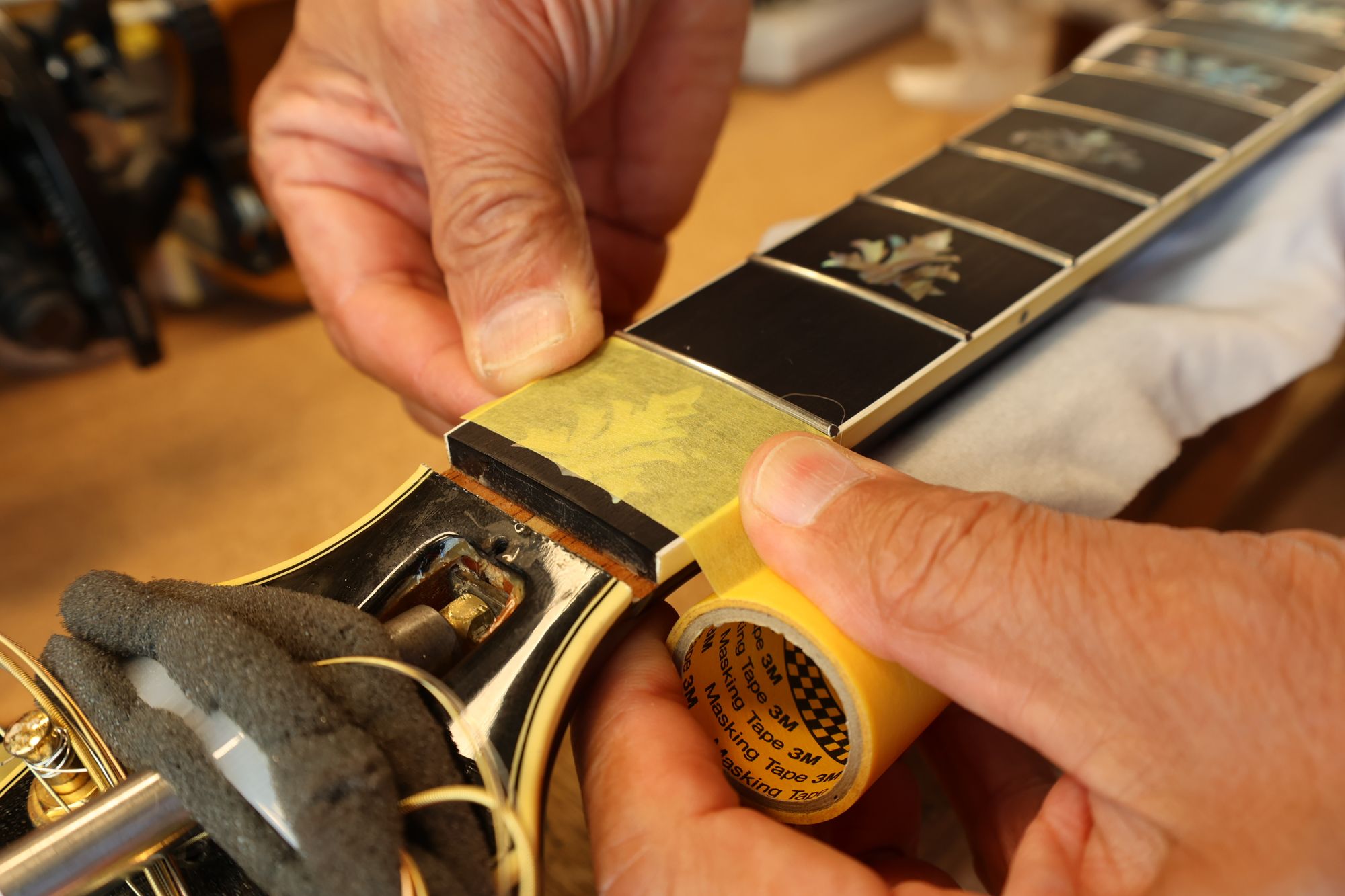 - 35.引き続いてフレットすりあわせを行いましょう。マスキングテープでフィンガーボードを保護します。