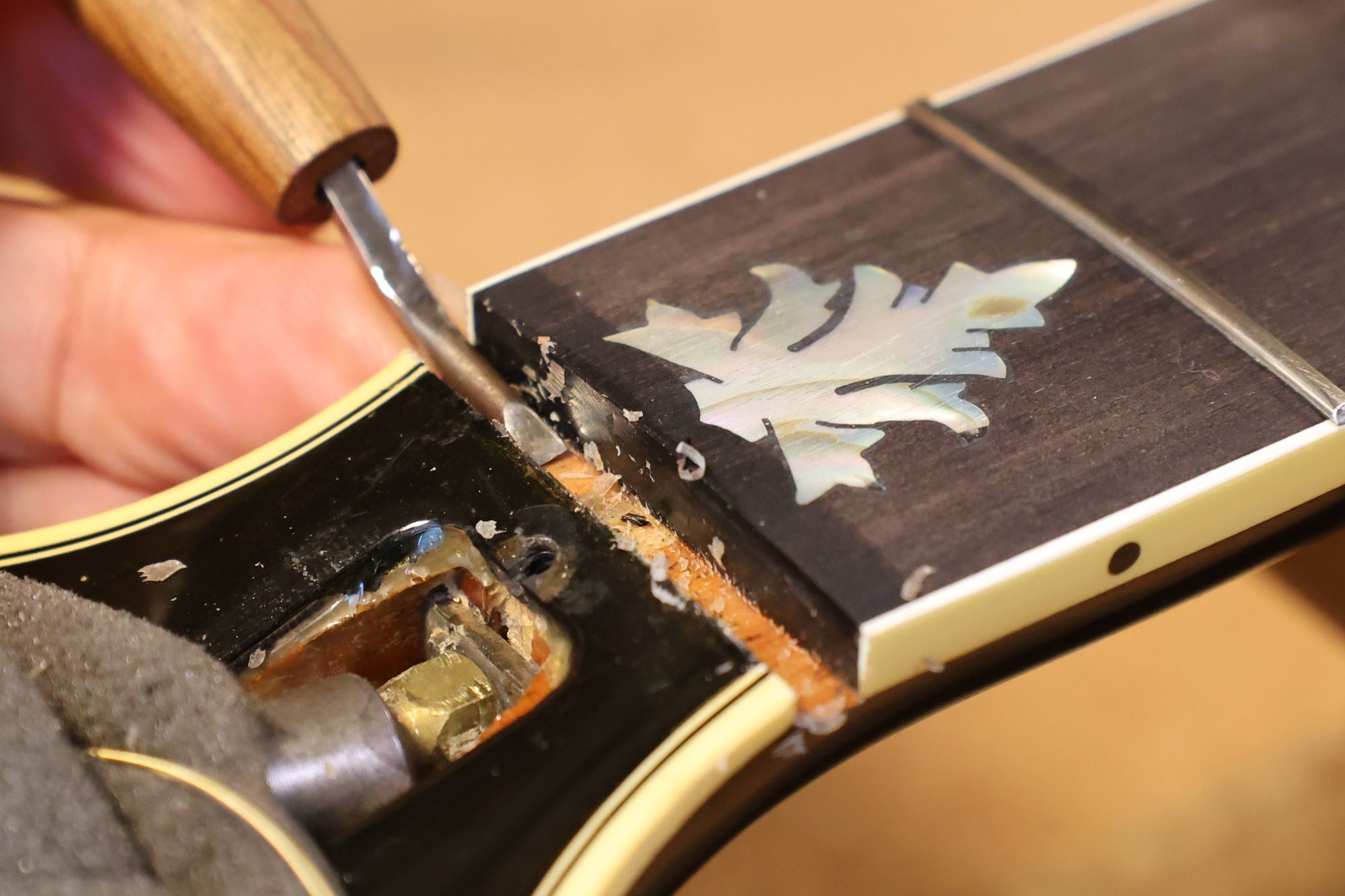 - 8.15フレット下部分までナイフが入りました。フィンガーボードとボディの取り外しが完了です。次にネックの取り外しを行いましょう。