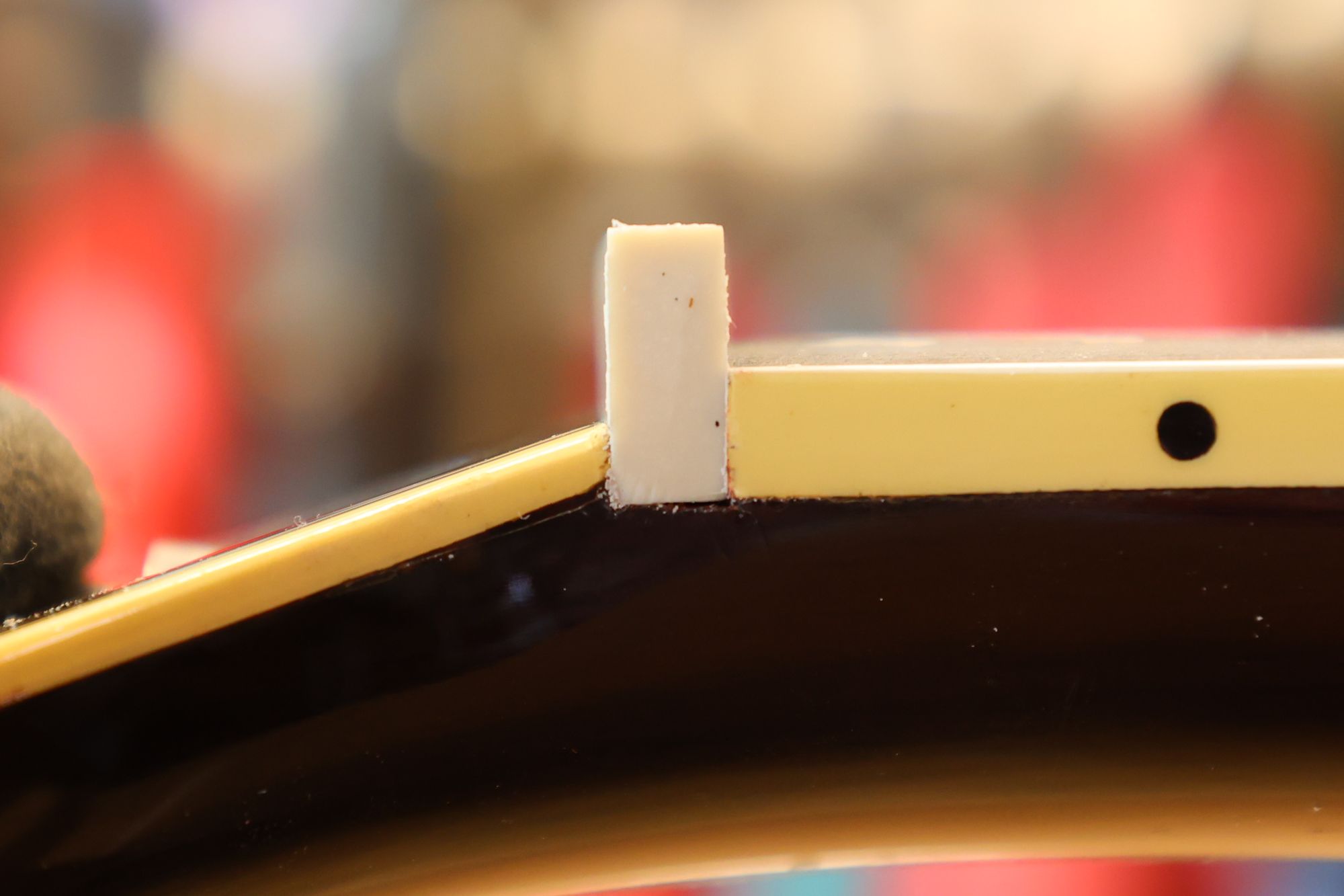 - 1.ボディ内部ブリッジの裏側に取り付けられているブリッジプレートです。弦のエンドポールが食い込んでしまう状態になっています。