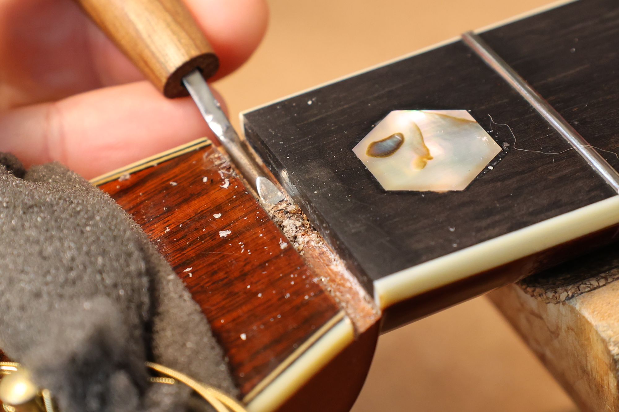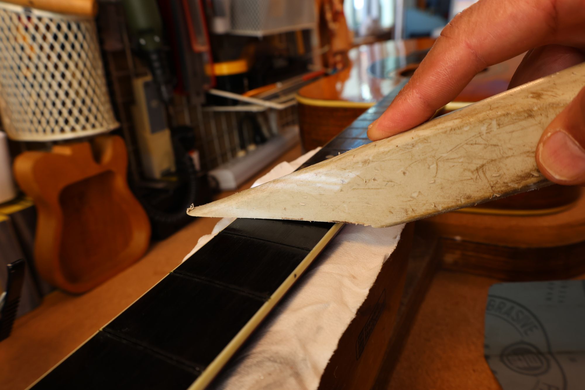 - 5.フレット溝の中のゴミ類を削り出します。このときもフレット溝エッジを傷つけないように注意します。