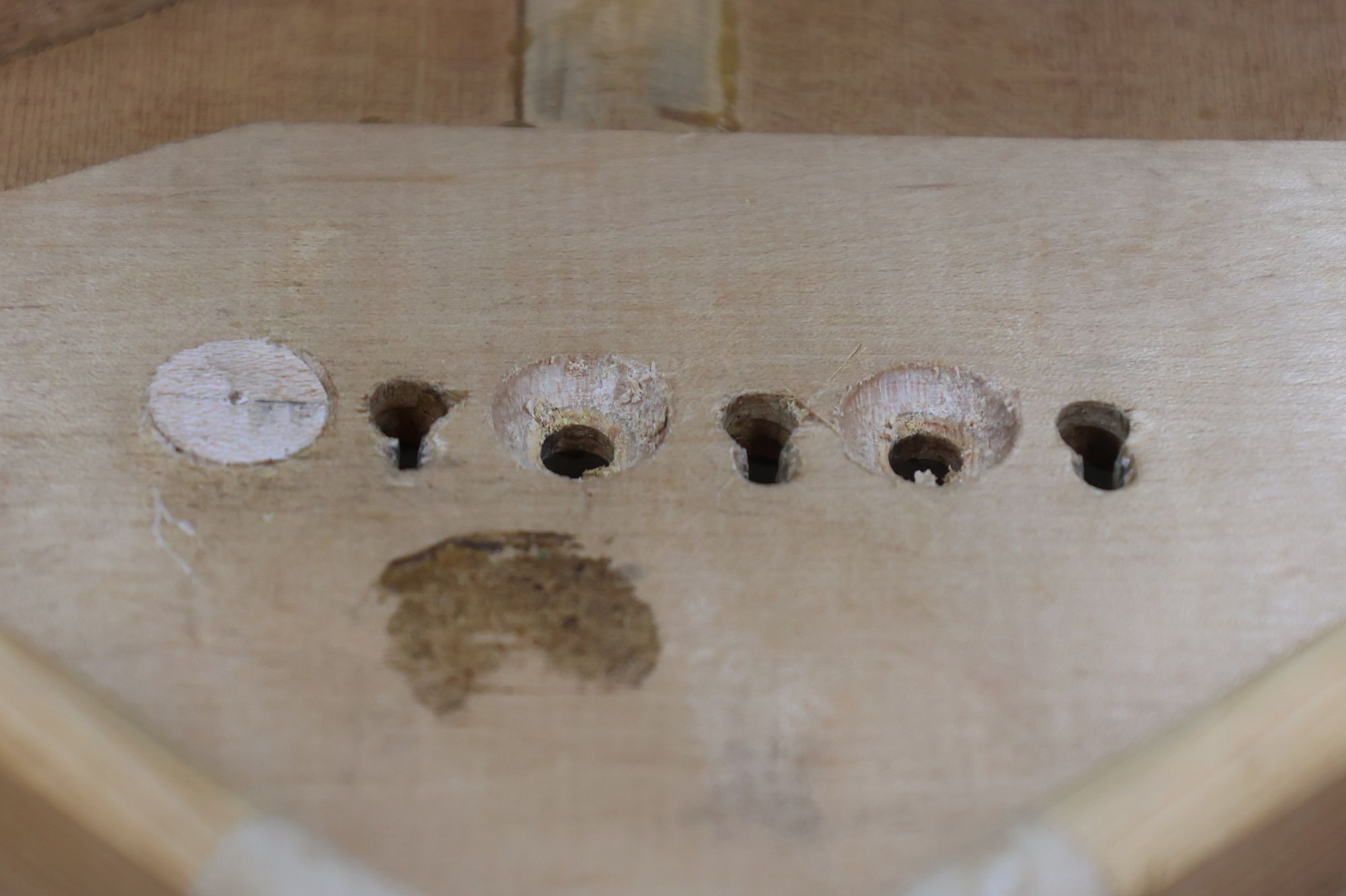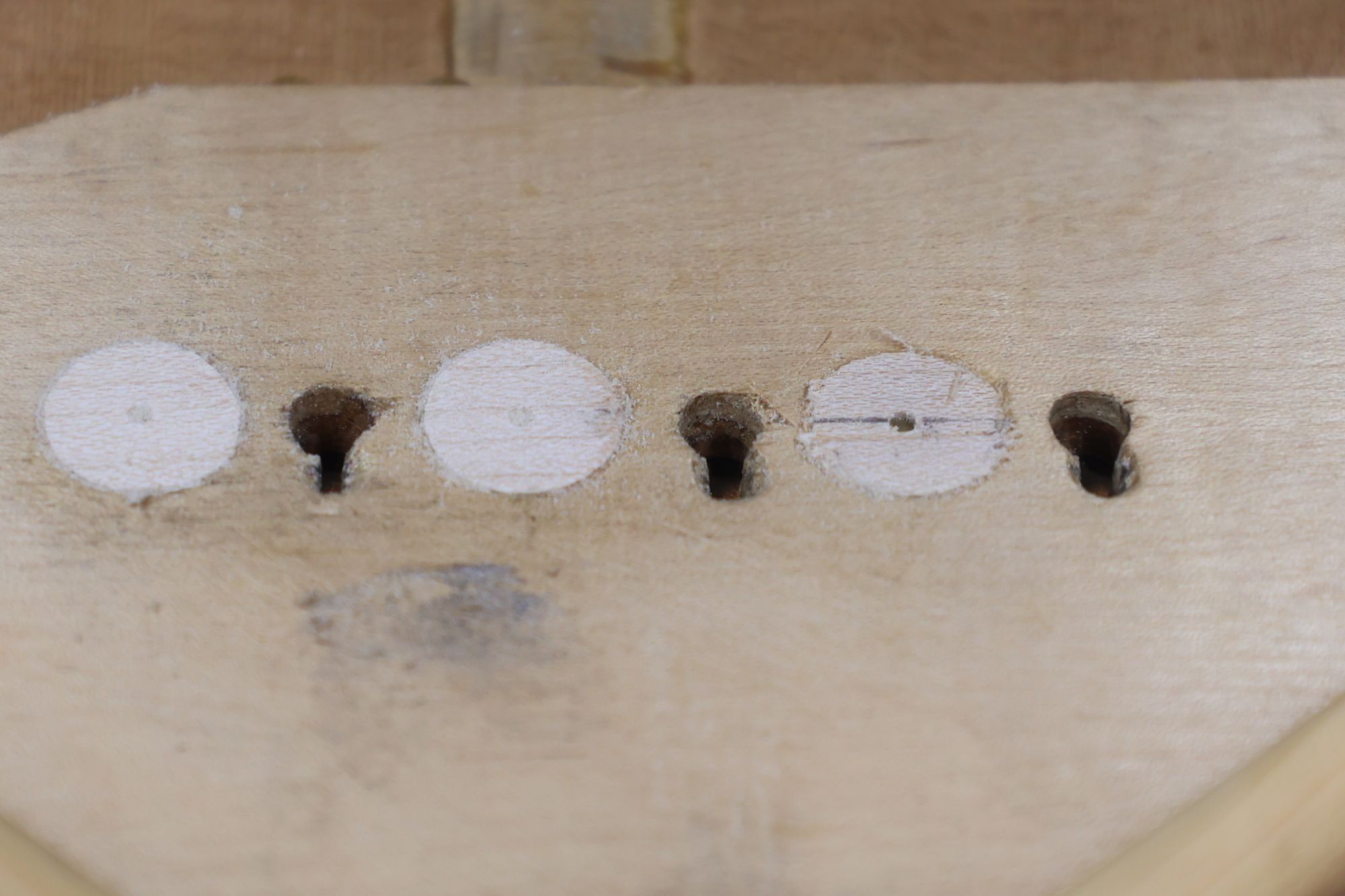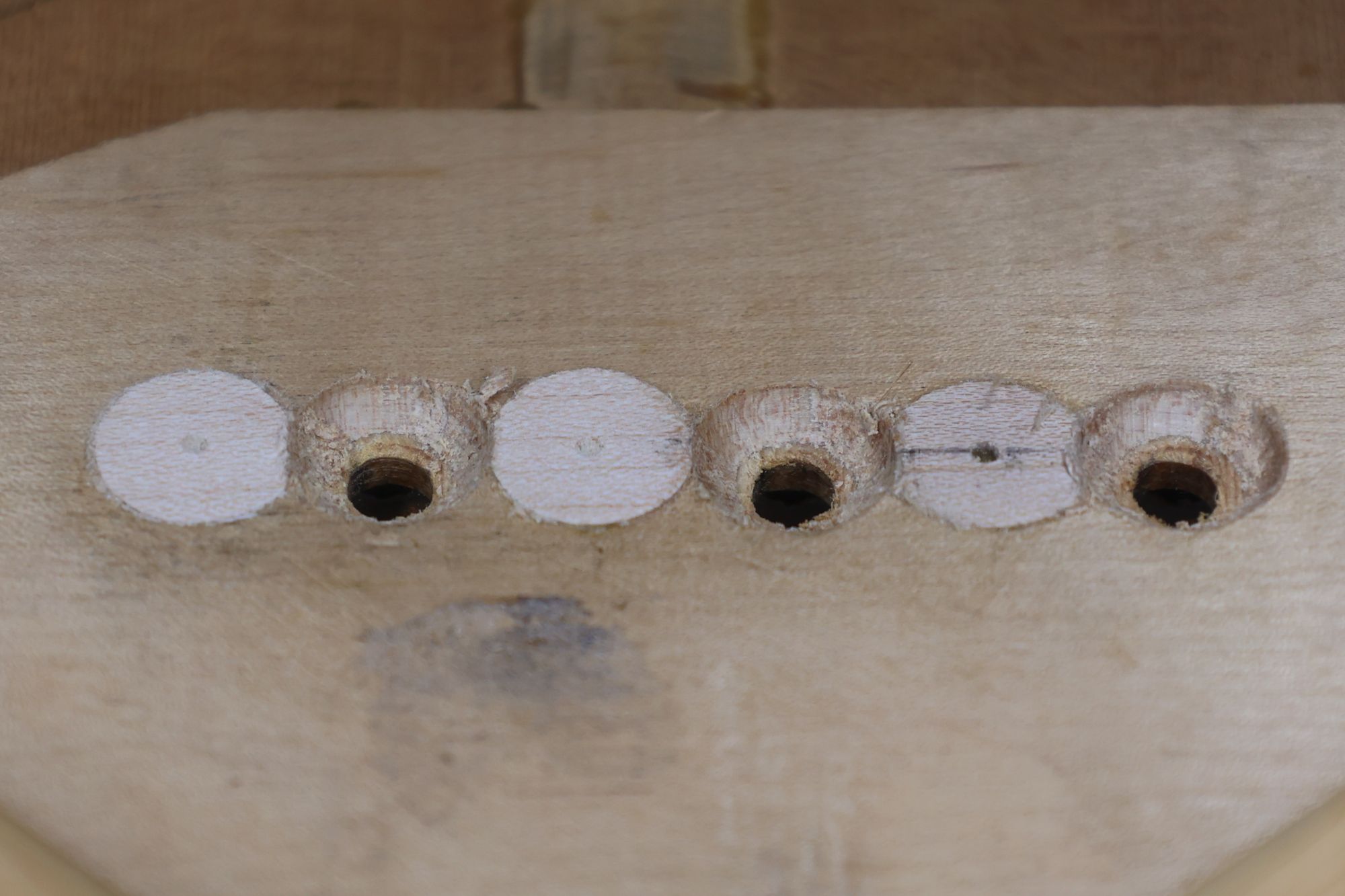 - 5.小穴があいたプラグです。まだ材に固定されています。