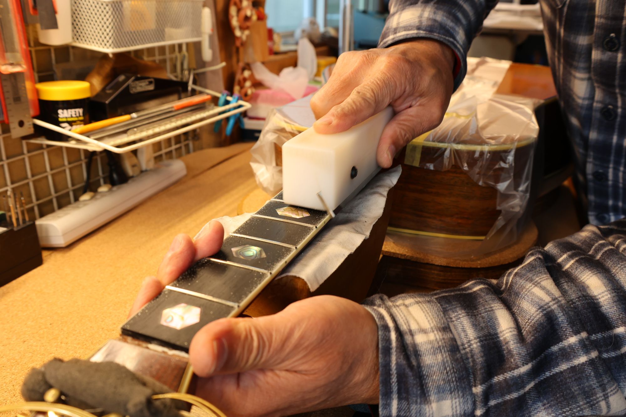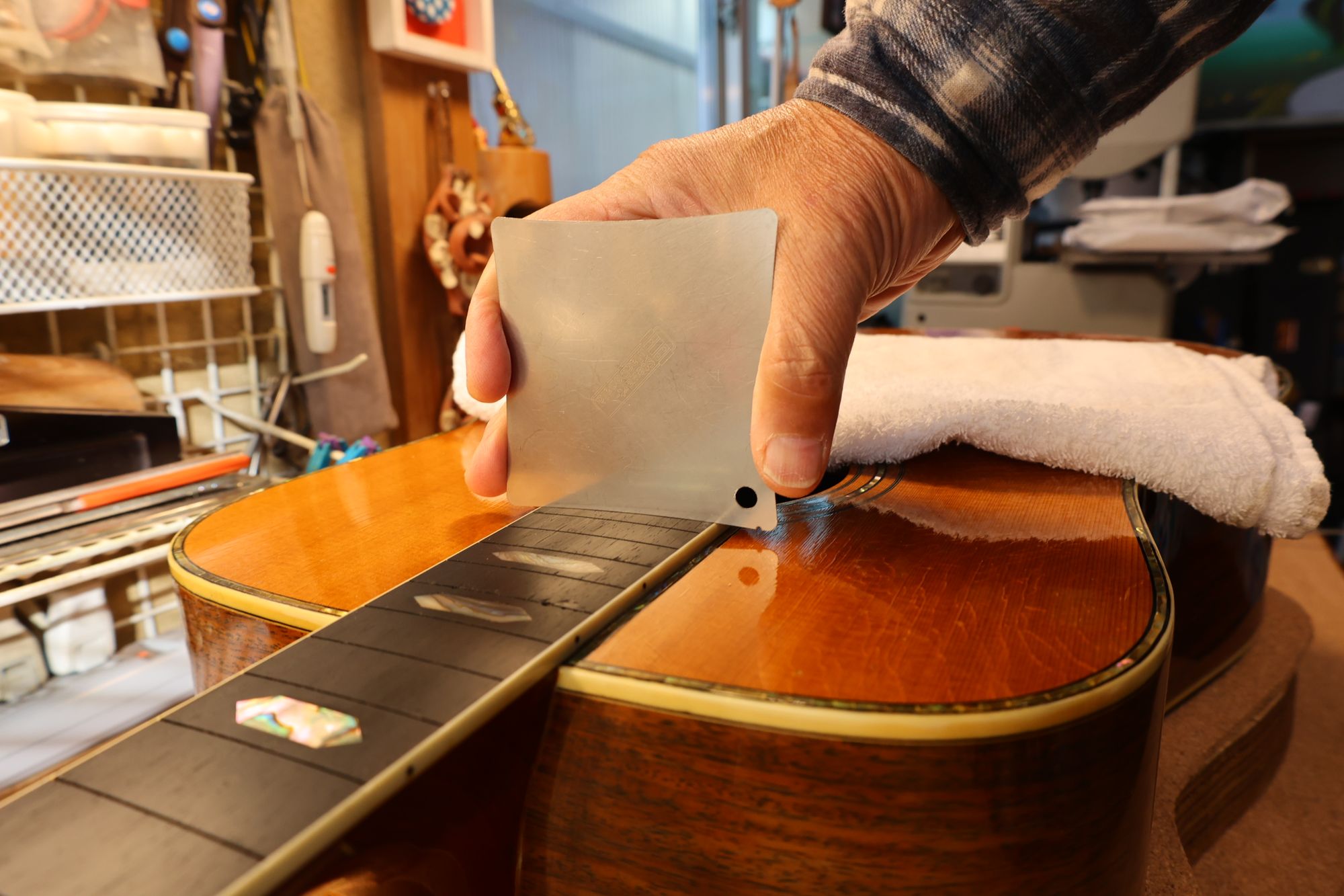 - 12.目視および指で触ってネック、フィンガーボードと段差のないことを確認しておきます。