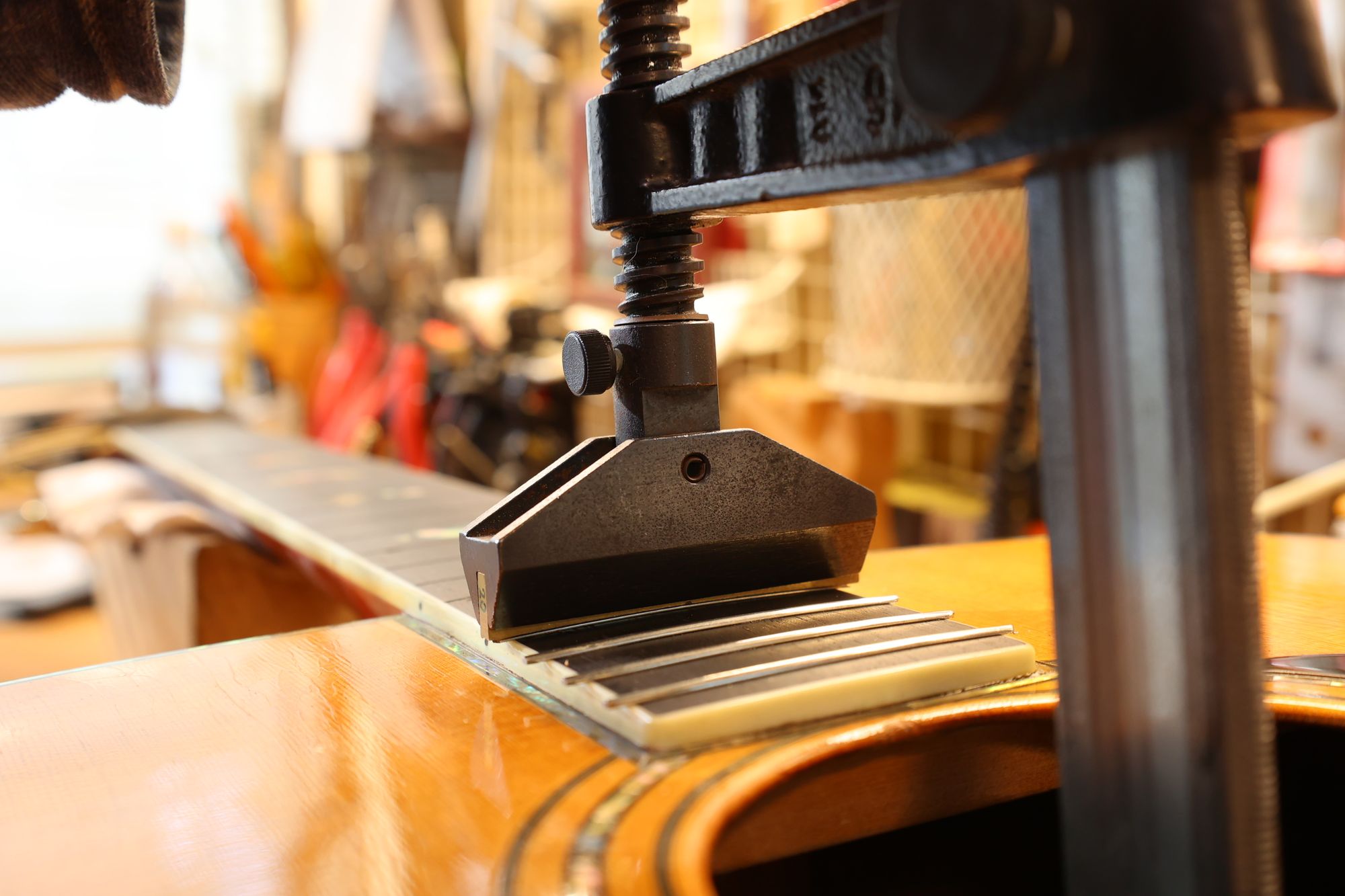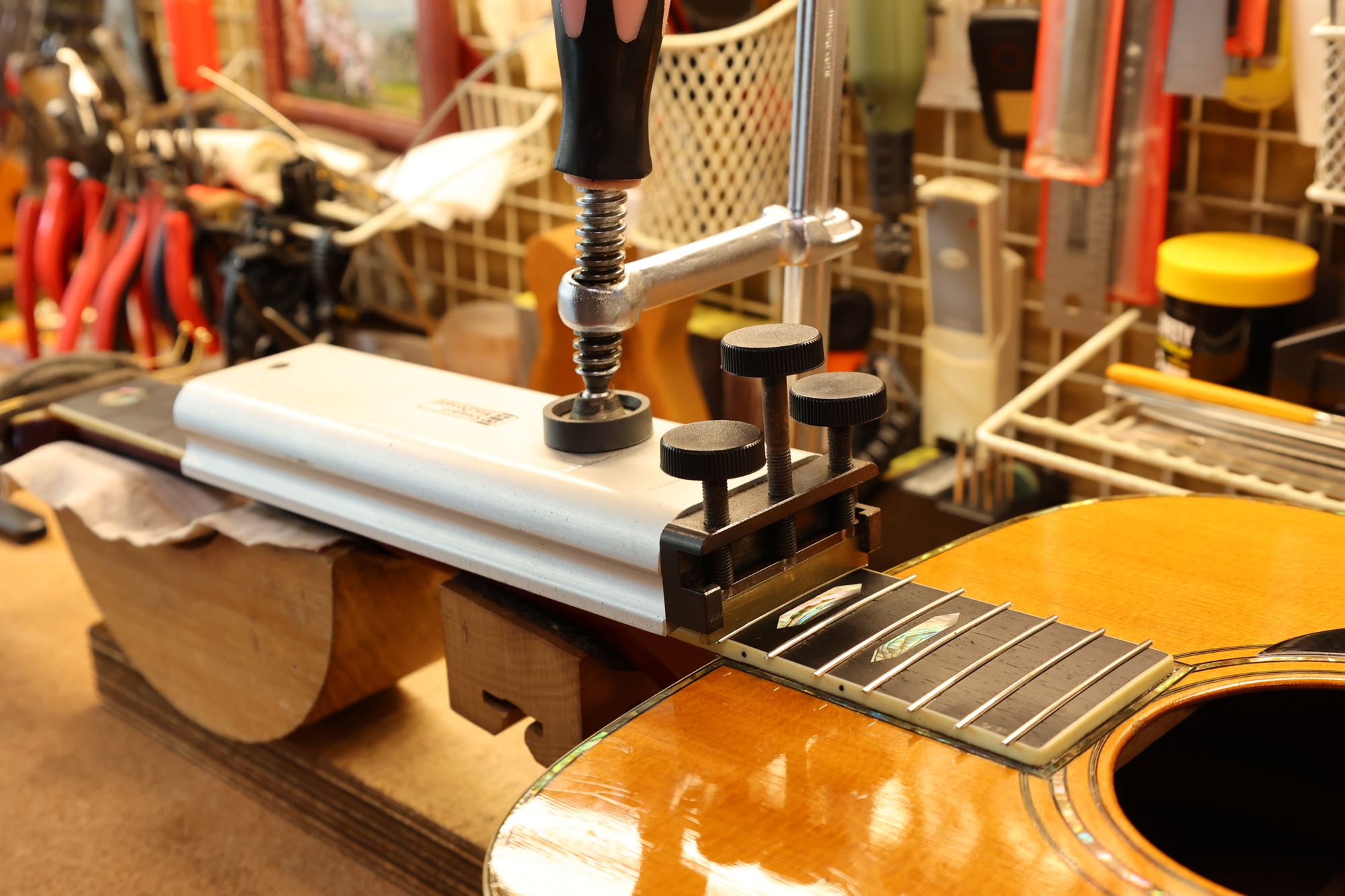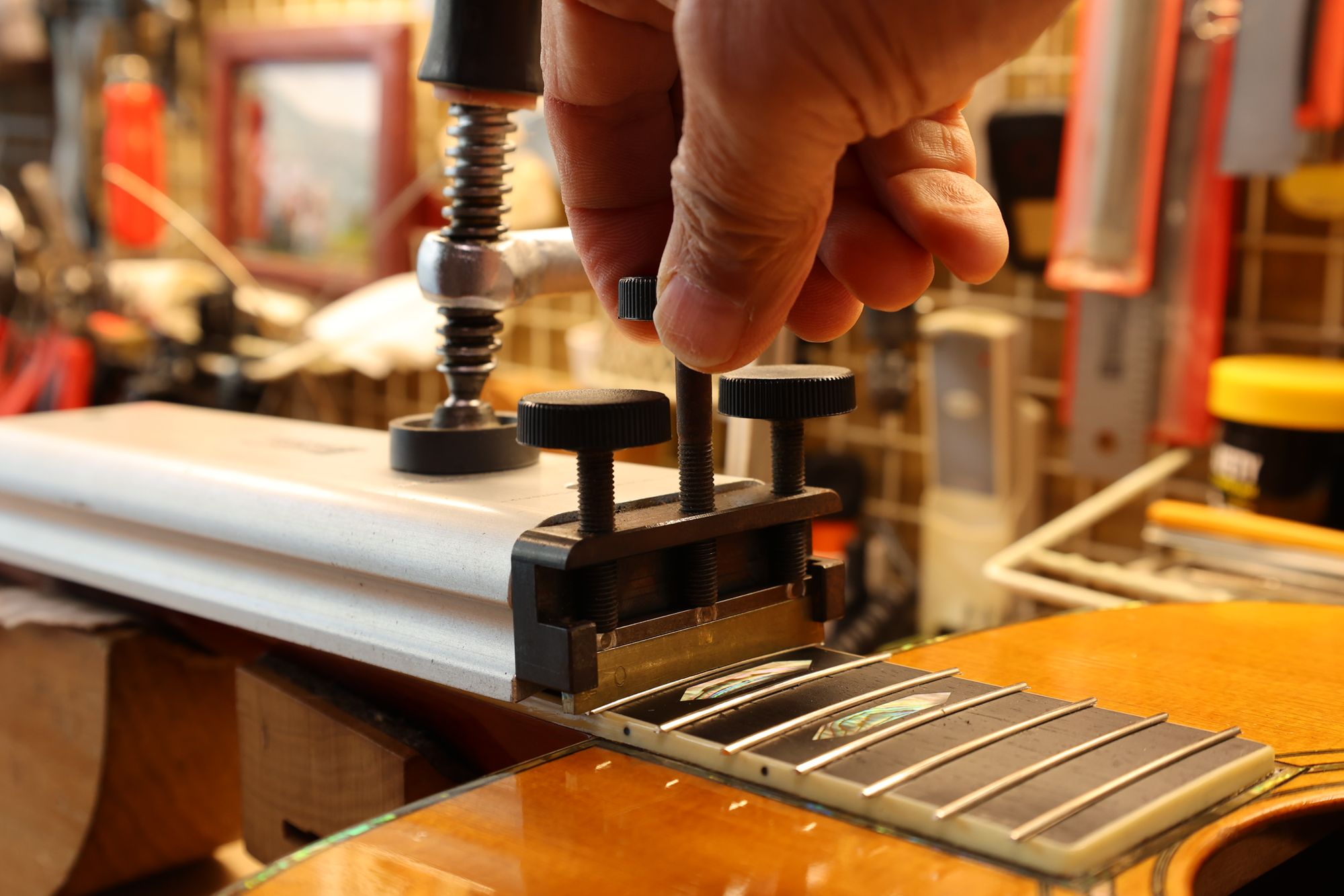 - 19.ネジを締めてフレットをプレスしていきます。