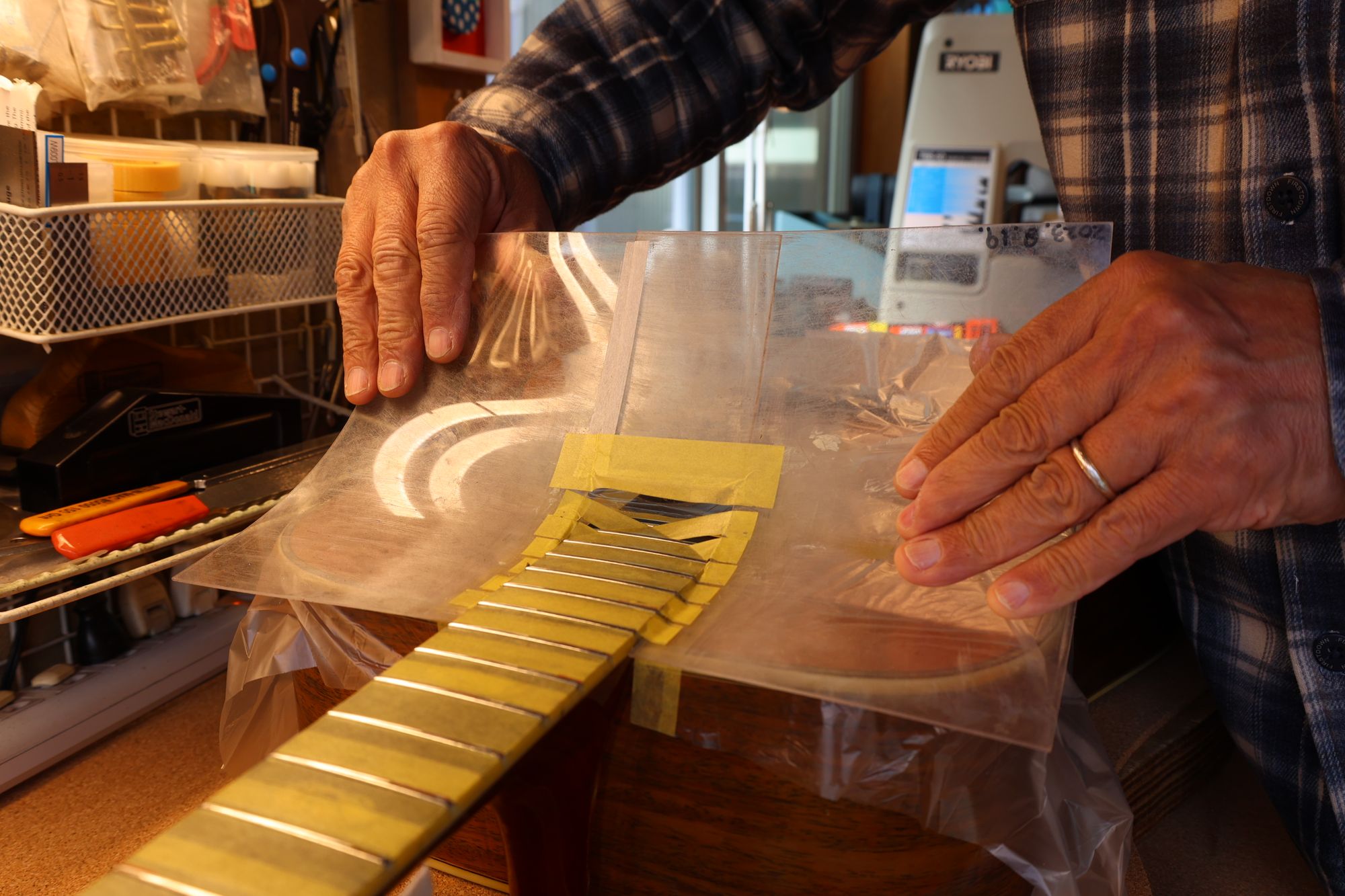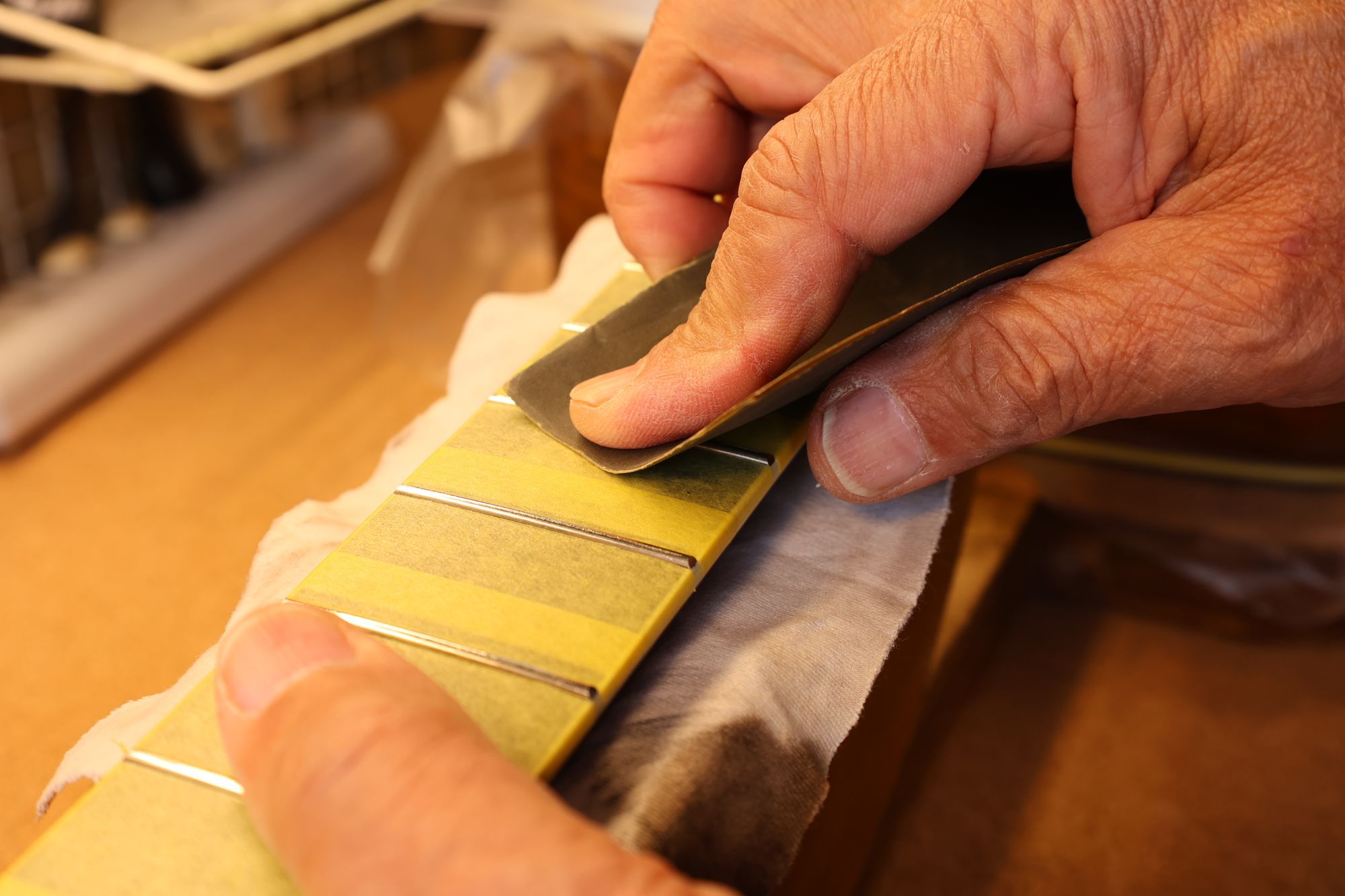 - 31.引き続いてフレットすりあわせを行いましょう。マスキングテープでフィンガーボードを保護します。