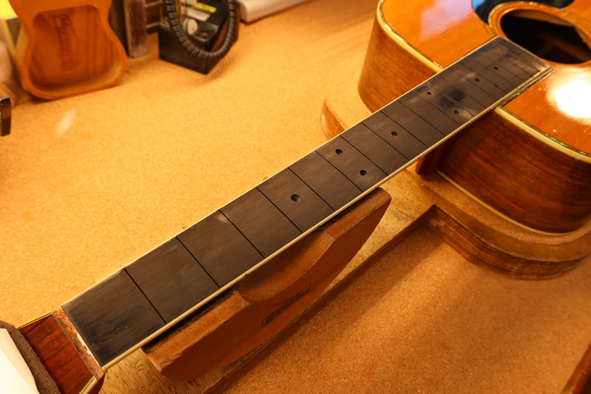 - 16.フレットプレスを行いました。とても美しいフィンガーボードです。
