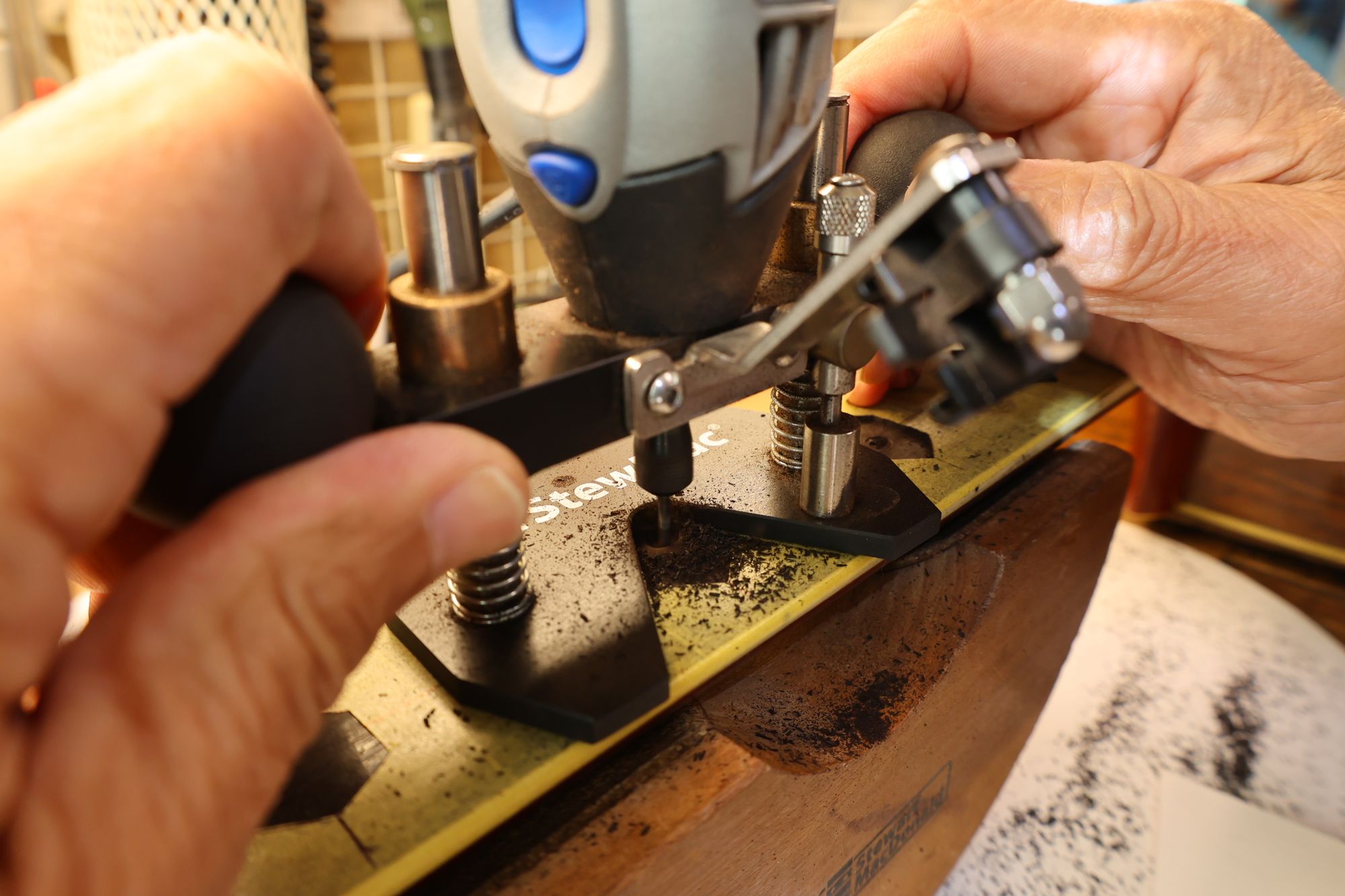 - 13.さらにミニルーターで弦の導出角度をつけていきます。
