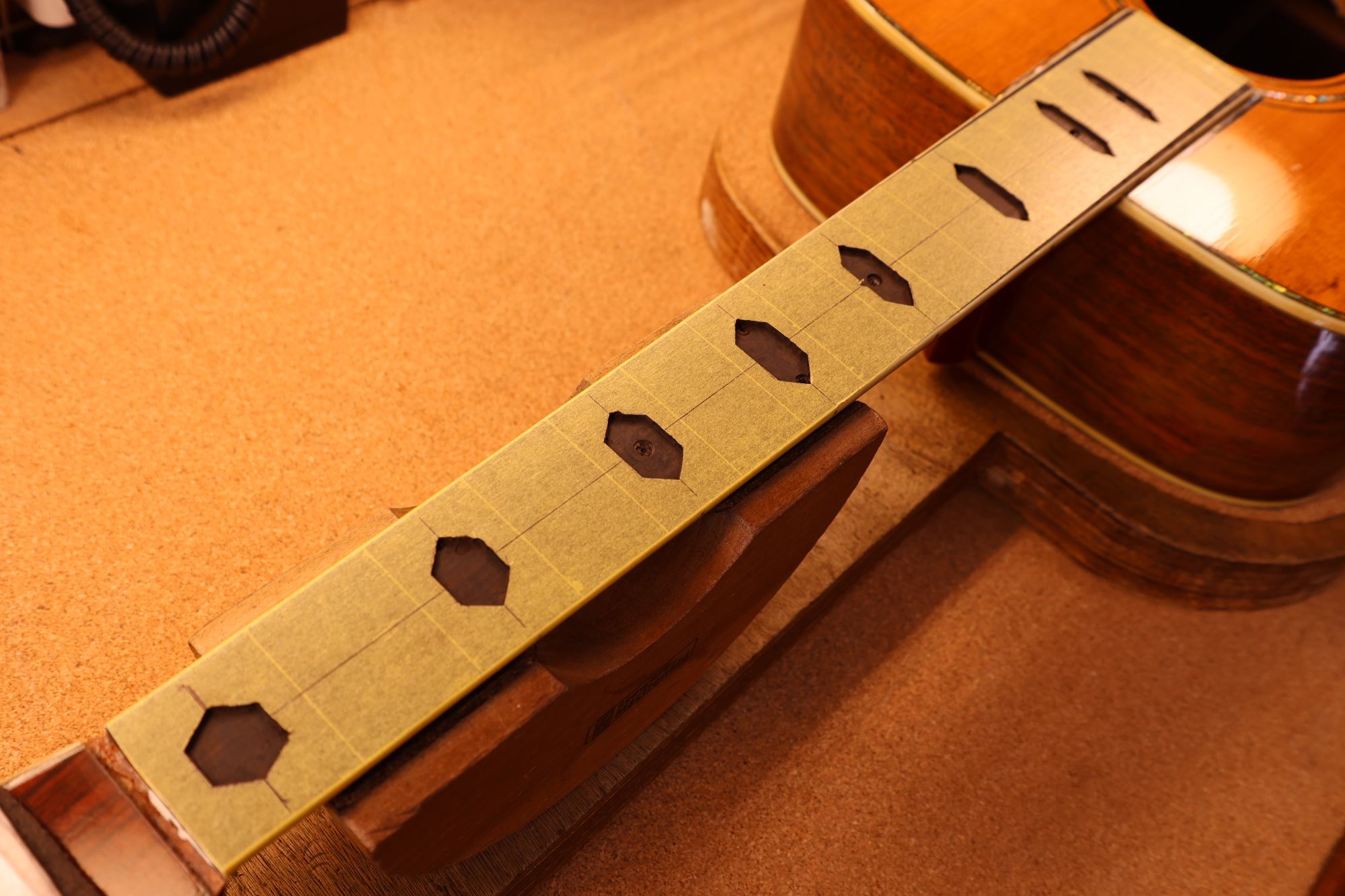 - 2.フレットを抜きました。丸形ポジションマークを六角形のものに入れ替えましょう。