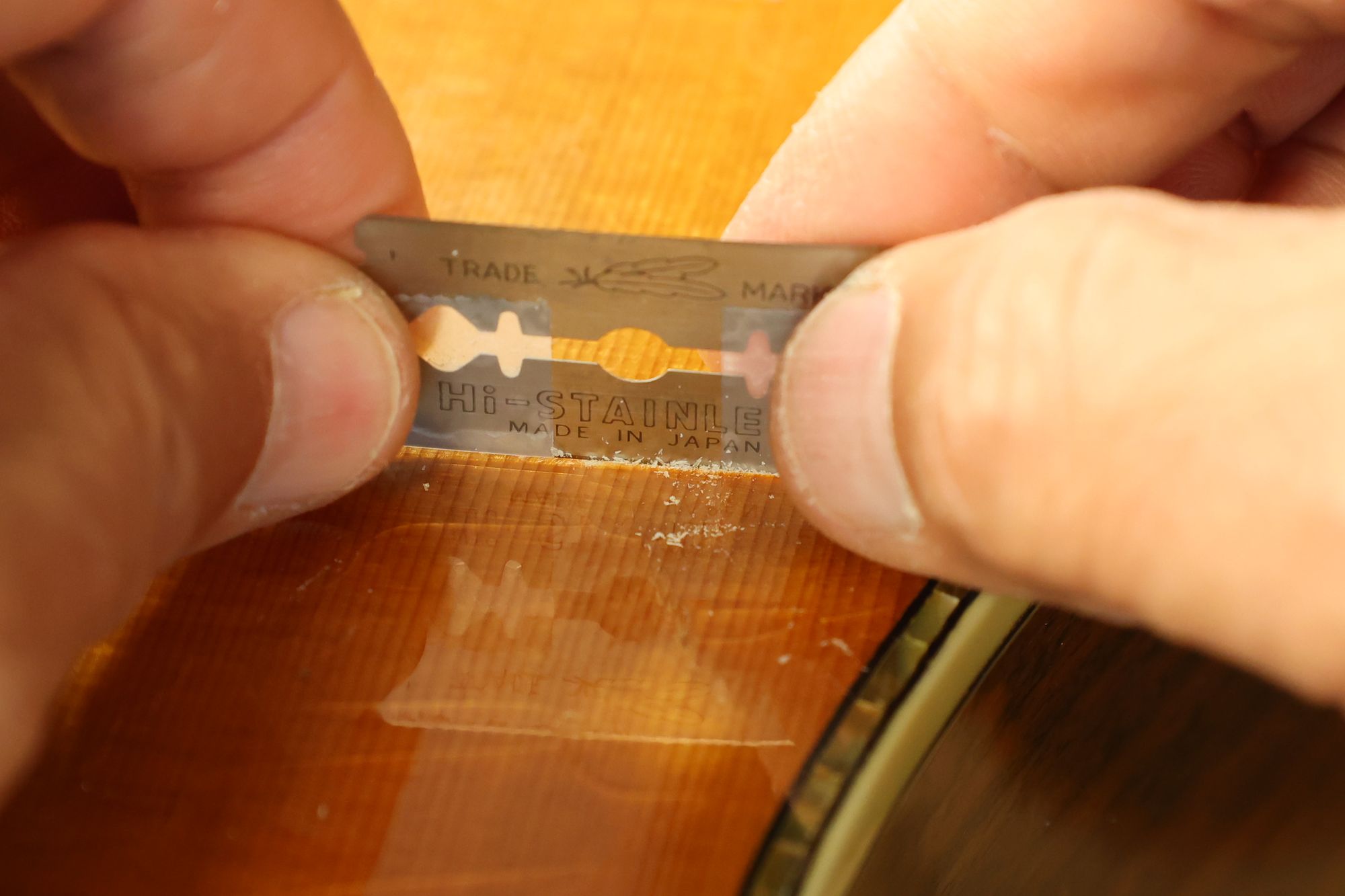 - 9.ラッカー乾燥後、スクレイパーで盛り上がった部分を削り取っていきます。