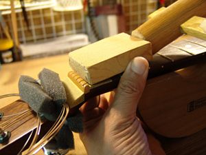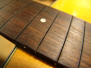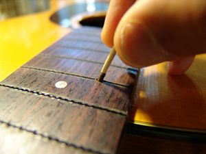 - 3.フレット交換の前にフィンガーボードにあけた穴を元に戻しましょう。穴径にあうようにエボニー片を丸く削ります。