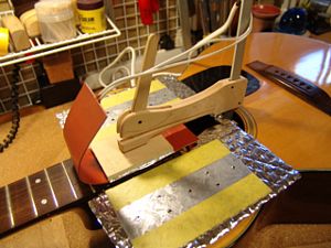 - 1.ブリッジにイントネーター、サウンドホールにチューナーを取り付けました。