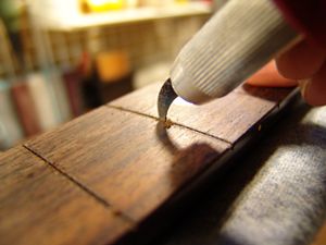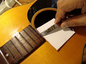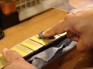 - 9.フレット溝の中のゴミ類を削り出します。このときもフレット溝エッジを傷つけないように注意します。