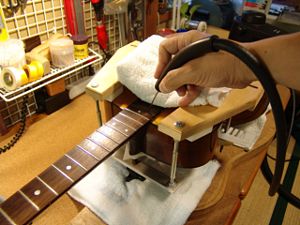 - 4. ラバーヒーターを使ってフィンガーボードを暖めます。(フレット交換を行いますので、20フレットまで外しています)