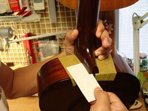 - 25.ネックとボディの間にサンドペーパー挟みます。