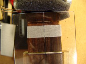 - 28.ネック取り付けの直線性を確認します。直線けがき線の入ったアクリル板をネックからブリッジにかけて乗せます。