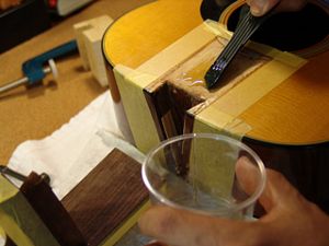 - 33.HideGlue(膠:ニカワ)をフィンガーボード裏とネック接合部に塗っていきます。