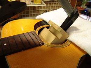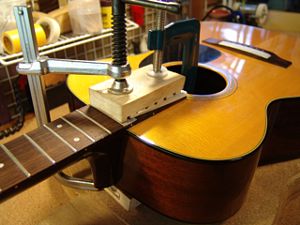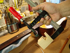 - 36.0.クランプと当て木でネックを固定し、あふれ出た接着剤をふき取っていきます。