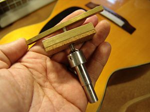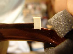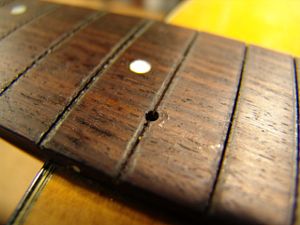 - 4.ドリル穴にエボニー材を押し込み、フィンガーボードを傷つけないように出た部分をカットします。