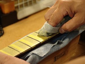 - 33.引き続いてフレットすりあわせを行いましょう。マスキングテープでフィンガーボードを保護します。