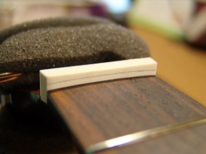 - 21.弦を張って弦高調整を行います。2フレットを指で押さえて1フレットと弦の隙間がギリギリに下がるまでナット高を下げます。