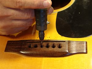 - 12.ブリッジピン穴加工を行います。まず、糸鋸で弦の導出口をサドル側へ引き寄せます。