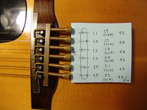 - 17.オリジナルナットから弦溝位置を読みとります。(1弦と6弦の位置で他の弦の位置が決まります)