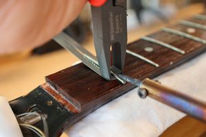 - 1.フレットを抜いていきましょう。はんだごてでフレットを暖めながらゆっくり抜いていきます。